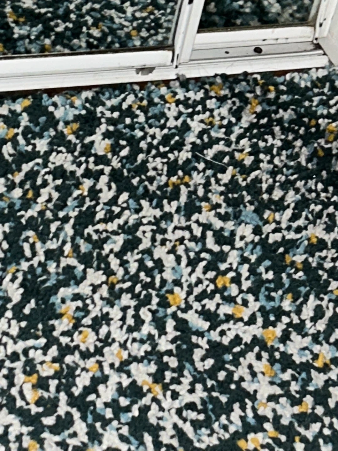 This rug has a dark green speckled pattern with white, yellow, and light blue accents. It's made of a soft, fluffy material. It's a great addition to any room!