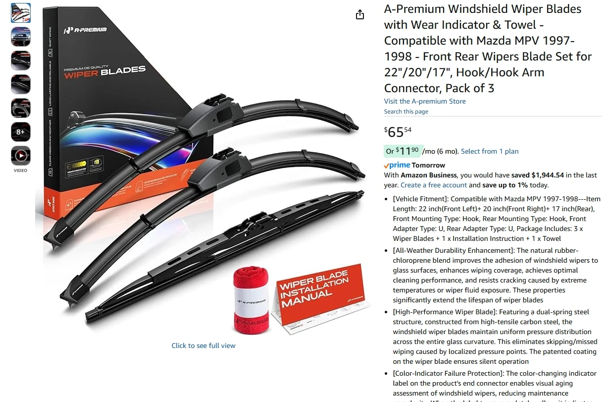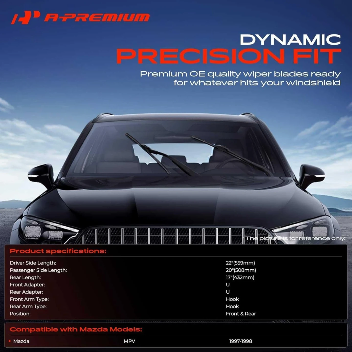 [Vehicle Fitment]: Compatible with Mazda MPV 1997-1998---Item Length: 22 inch(Front Left)+ 20 inch(Front Right)+ 17 inch(Rear), Front Mounting Type: Hook, Rear Mounting Type: Hook, Front Adapter Type: U, Rear Adapter Type: U, Package Includes: 3 x Wiper Blades + 1 x Installation Instruction + 1 x Towel