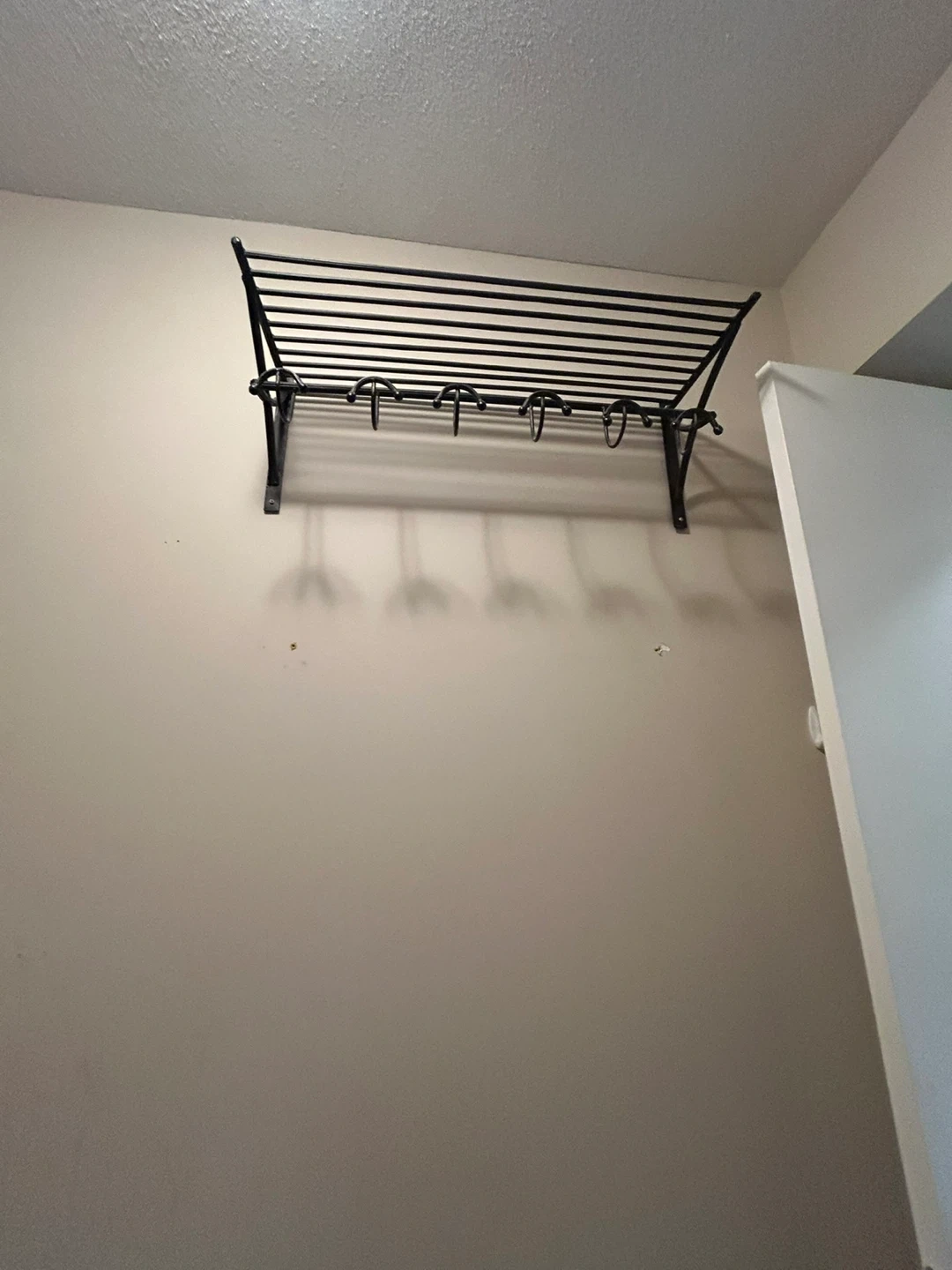 This elegant black metal shelf features a slatted top and five hooks below. It's wall-mounted for convenient storage. Useful for hanging coats, hats, or bags in an entryway or mudroom. Screws included.