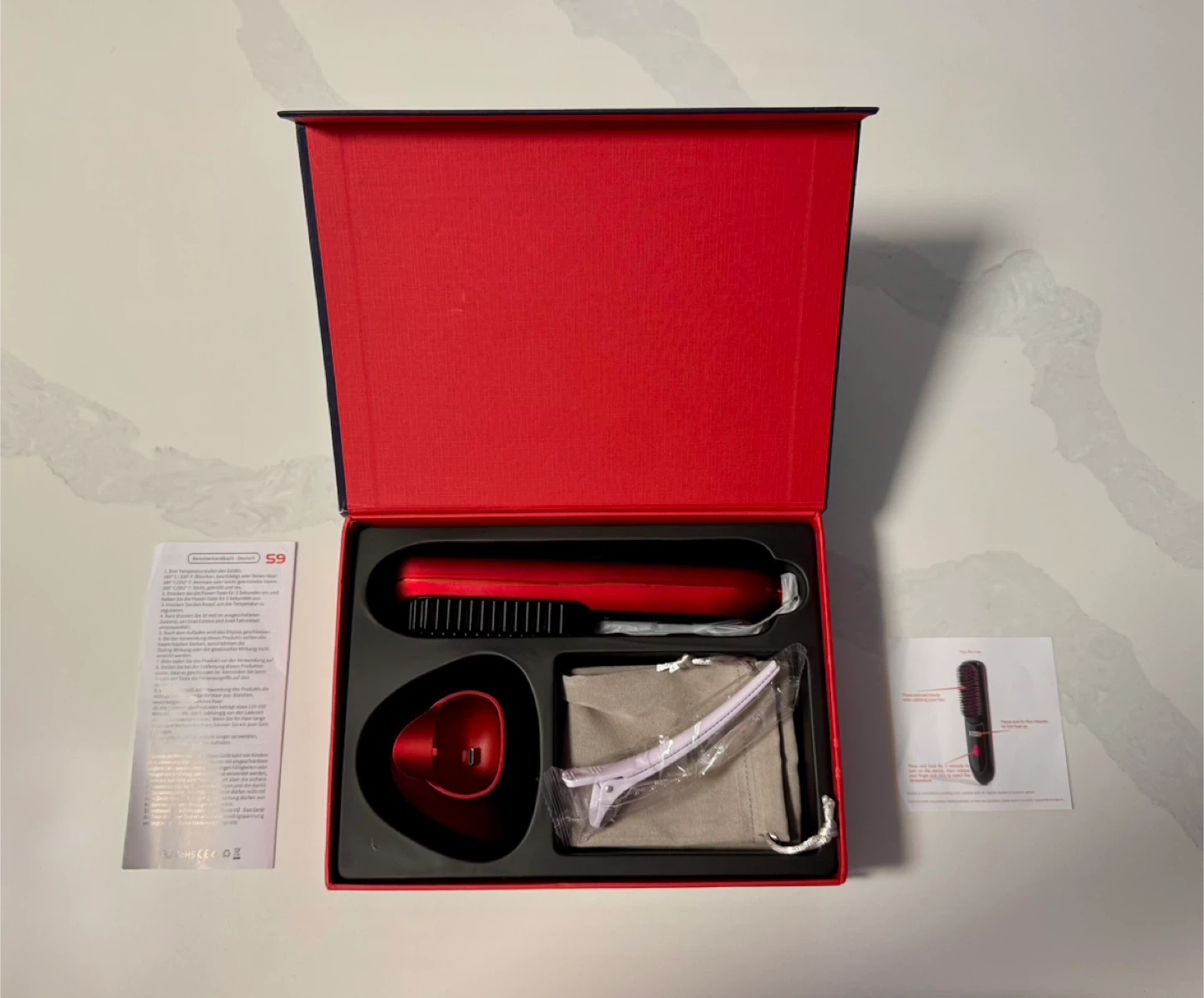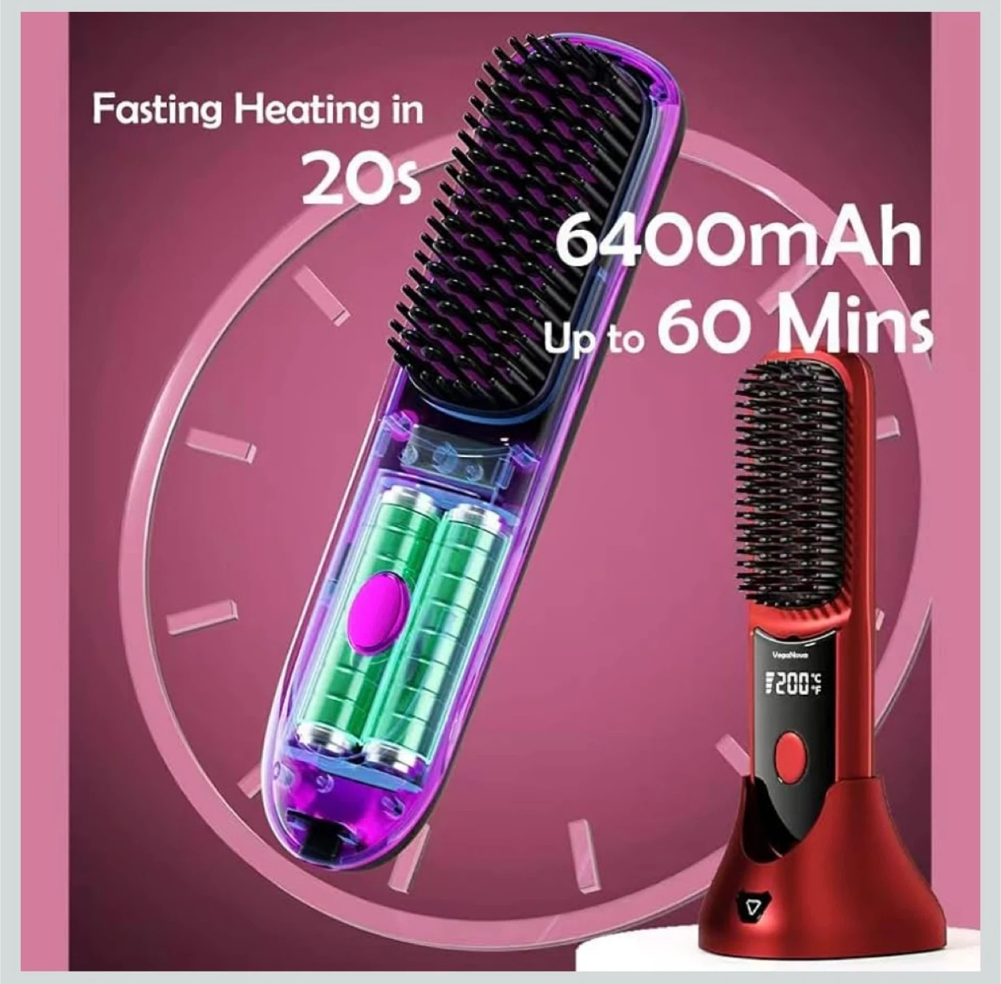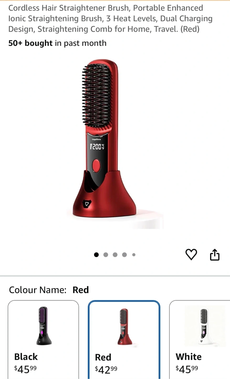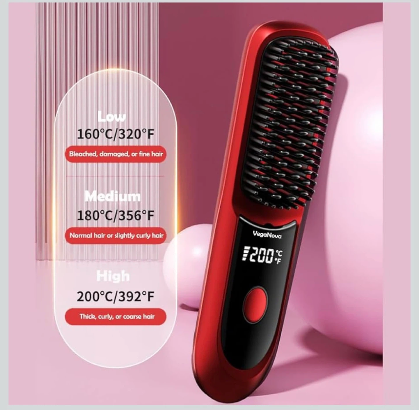 This VegaNova cordless hair straightening brush comes in red and includes a charging dock and Type-C cable. It has a 6400mAh battery for all-day power and features 200M ions for anti-frizz results. It also comes with hair clips and a storage pouch. This brush offers 3 heat levels.