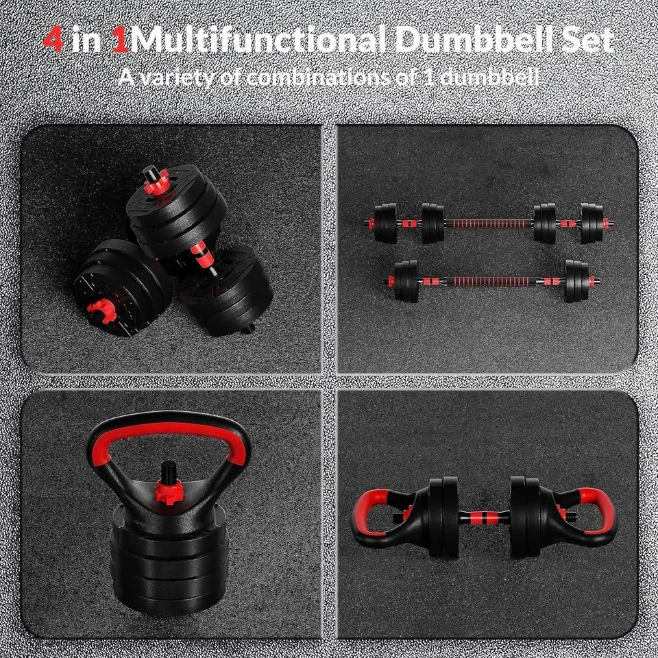 This is a 70 lbs (30 kg) adjustable dumbbell set that can also be used as barbells, kettlebells, and push-up stands. The weight is adjustable for single dumbbells (6-35 lbs), kettlebells (4-27.5 lbs), and barbells (8-71 lbs). The dumbbell pieces are made of durable, odorless PE material with an iron, mud, and sand fill, designed to protect floors. The dumbbell bar has a non-slip texture for a better grip. The barbell connector is made with a steel tube and 20mm thick foam for comfort during exercises like neck presses. It includes four safety nuts to keep the weights secure. Easy to assemble.