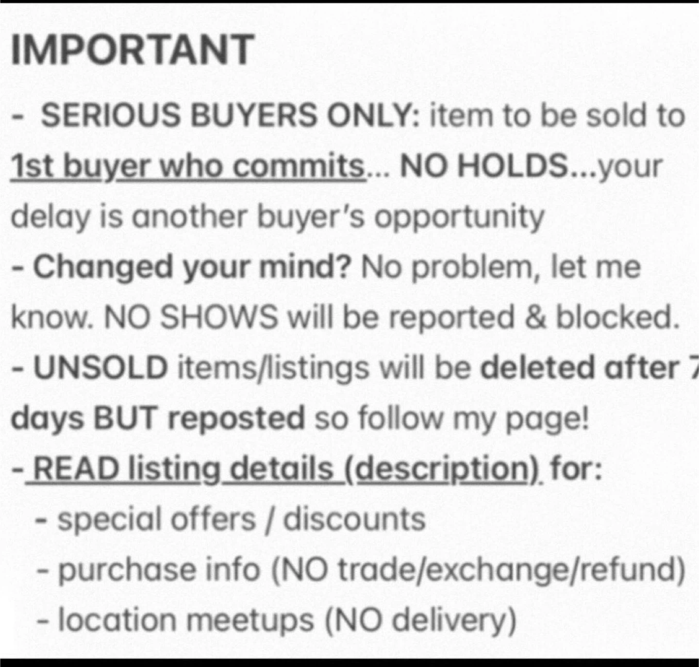 SERIOUS BUYERS ONLY / FINAL SALE / Cash Payment at pickup / NO HOLDS (Items will be sold on a FIRST-COME/PAYMENT-FIRST-SERVE basis!)