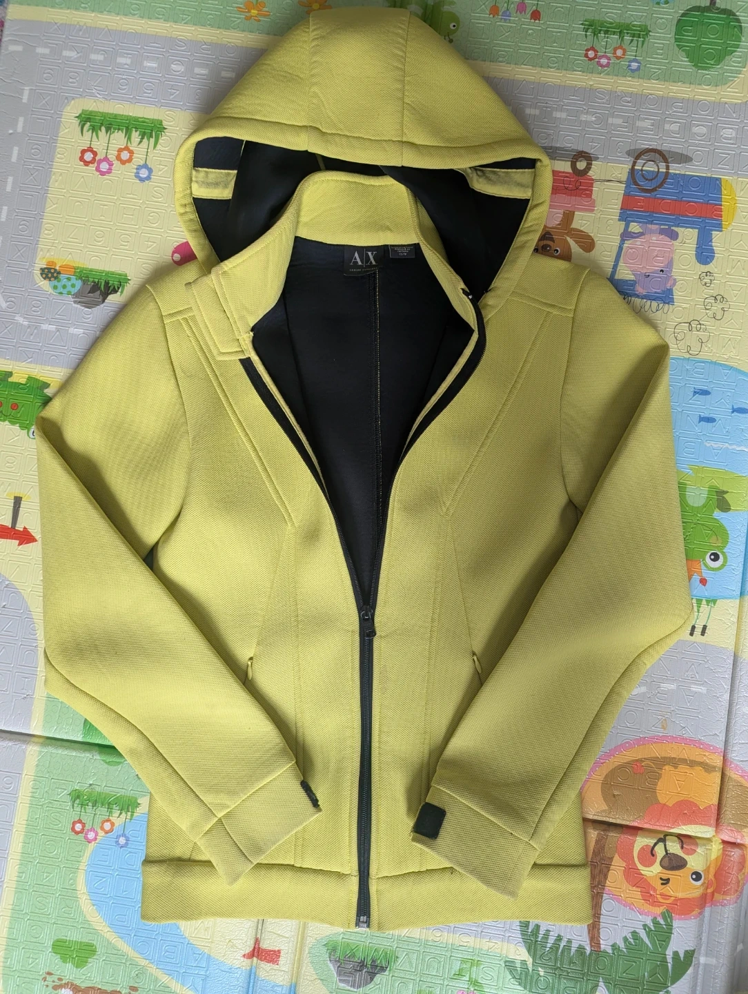 Armani Exchange AX zip-up hoodie jacket in a bright yellow colour. It's a size XS/TP. This jacket features a full zip closure and a hood.