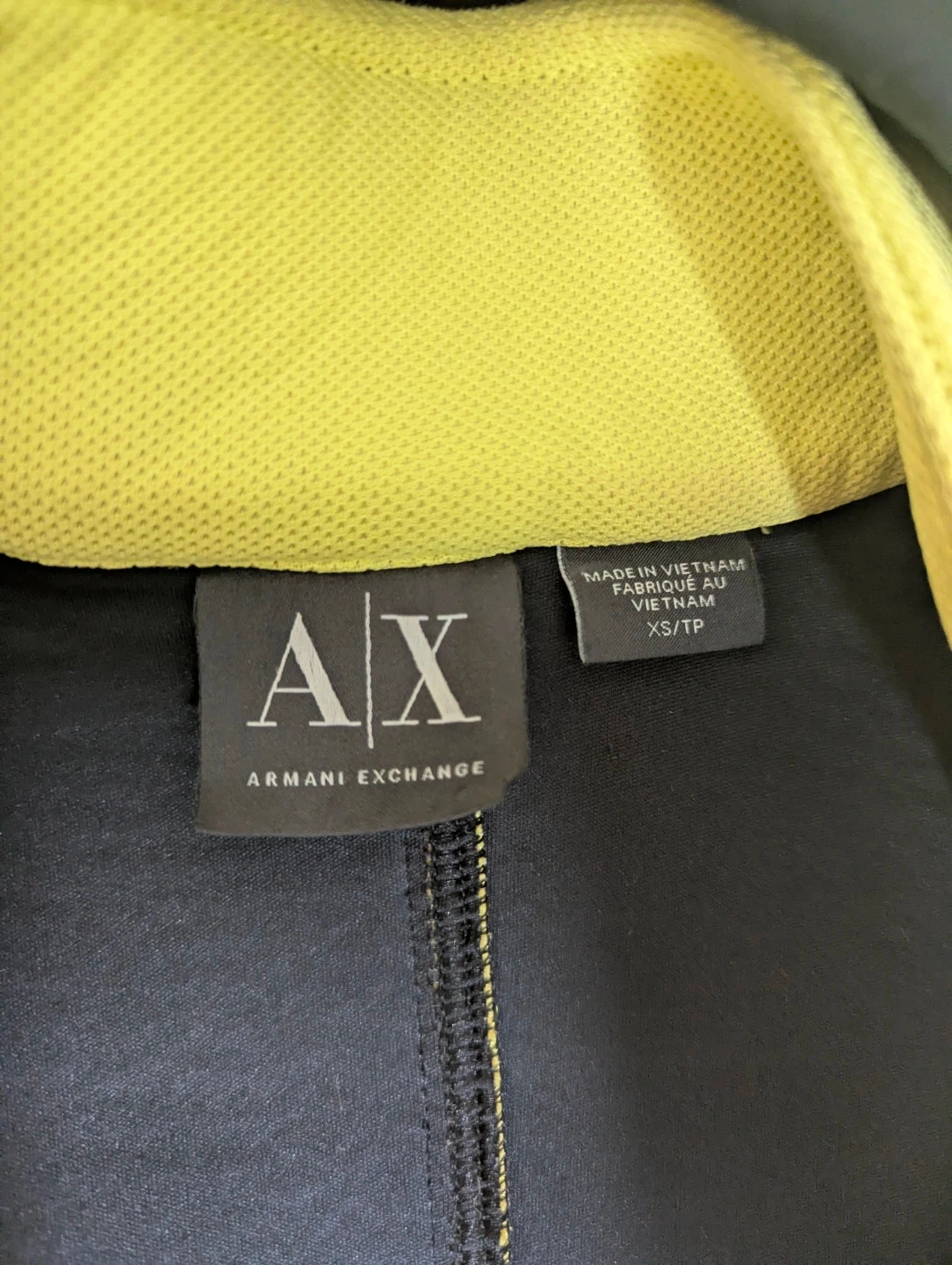 Armani Exchange AX zip-up hoodie jacket in a bright yellow colour. It's a size XS/TP. This jacket features a full zip closure and a hood.
