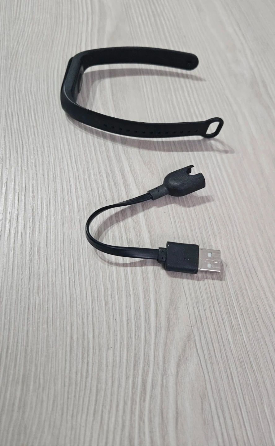 This listing is for a black Xiamo Fitness Band Version 3, along with its USB charging cable. The strap is made of flexible material, suitable for daily wear. The charger cable connects via USB for convenient power-ups.