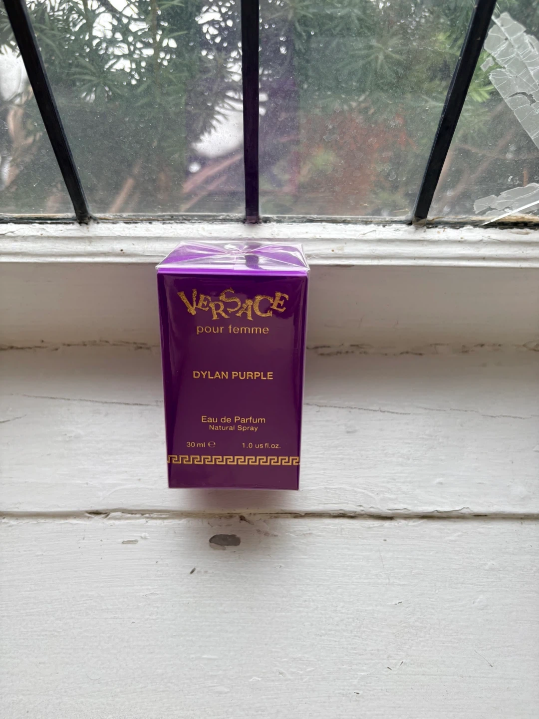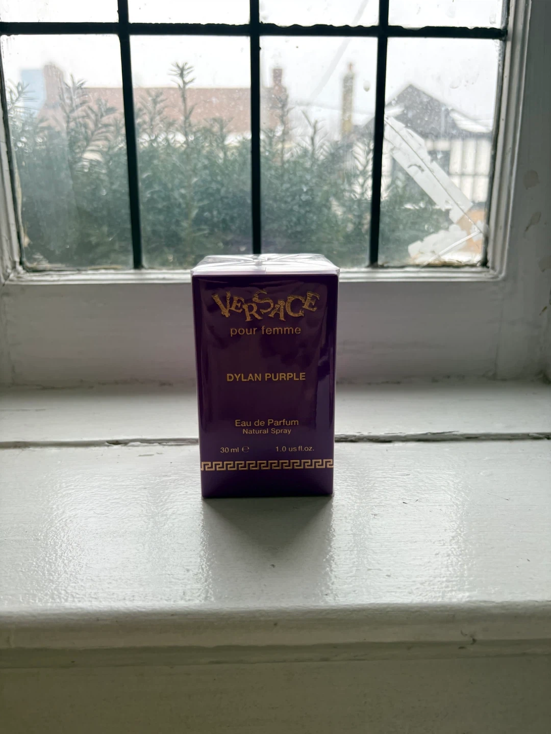 Versace - Pour Femme - Dylan Purple Eau de Parfum. 30ml bottle. This fragrance comes in its original box. All sealed. Original price: $104. On the website the product is described: “This fresh and fruity fragrance has an addictive opening, like a tribute to the iced delights of Italy and its iconic citrus fruits. Purple reflections and a delicate, scented breeze are a representation of a hypnotic sunset by the water.” Dylan Purple is a bright, modern, and elegant fruity-floral scent from Versace that blends juicy citrus notes with fragrant freesia and smooth woods. Its key notes are Bitter Orange Italy, Purple Freesia, and Cedarwood Virginia. Helping my aunt downsize for her move.