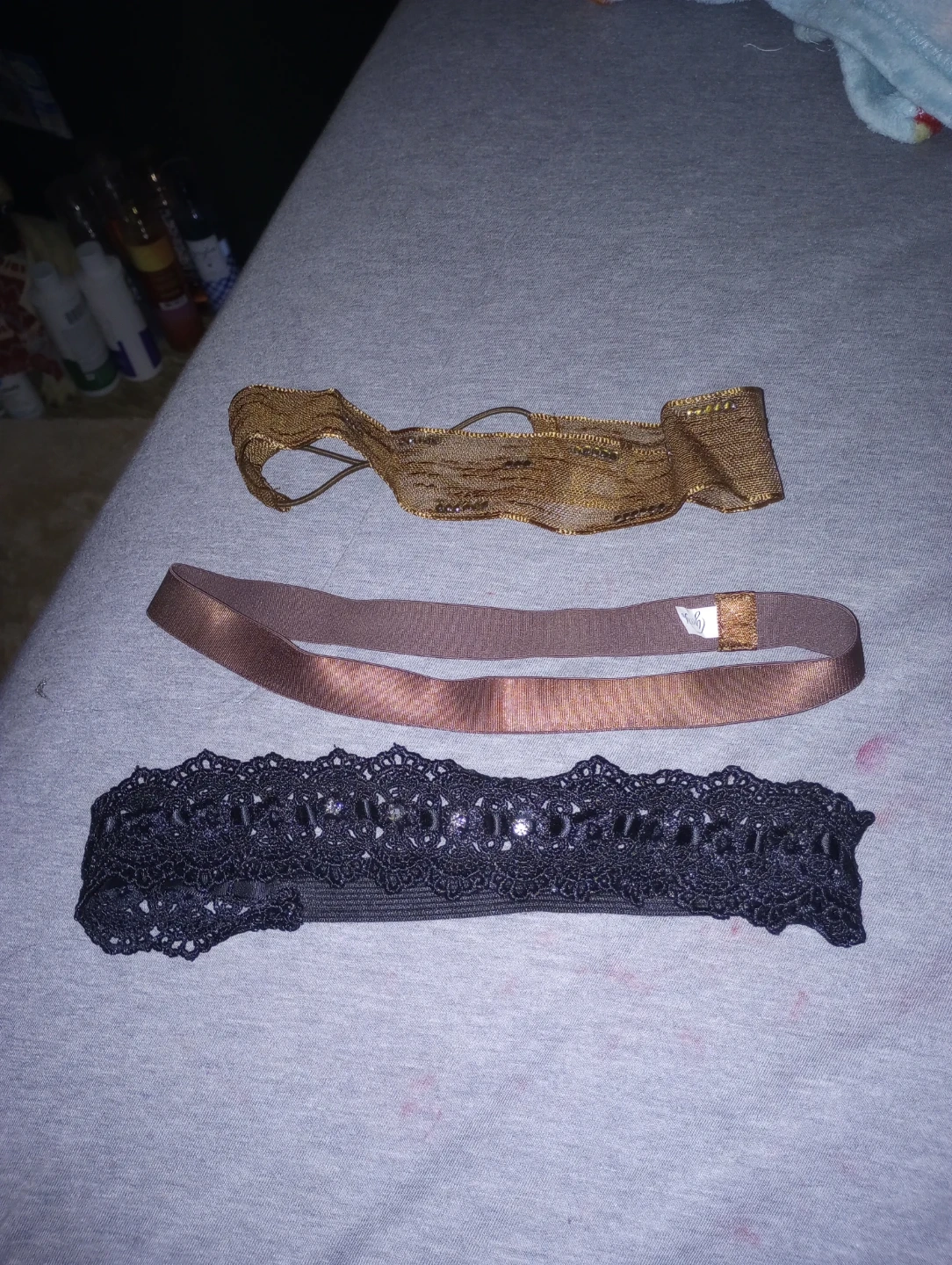 This set includes three headbands: one gold mesh, one rose gold metallic band, and one black lace band with embellishments. Great for accessorizing any outfit!