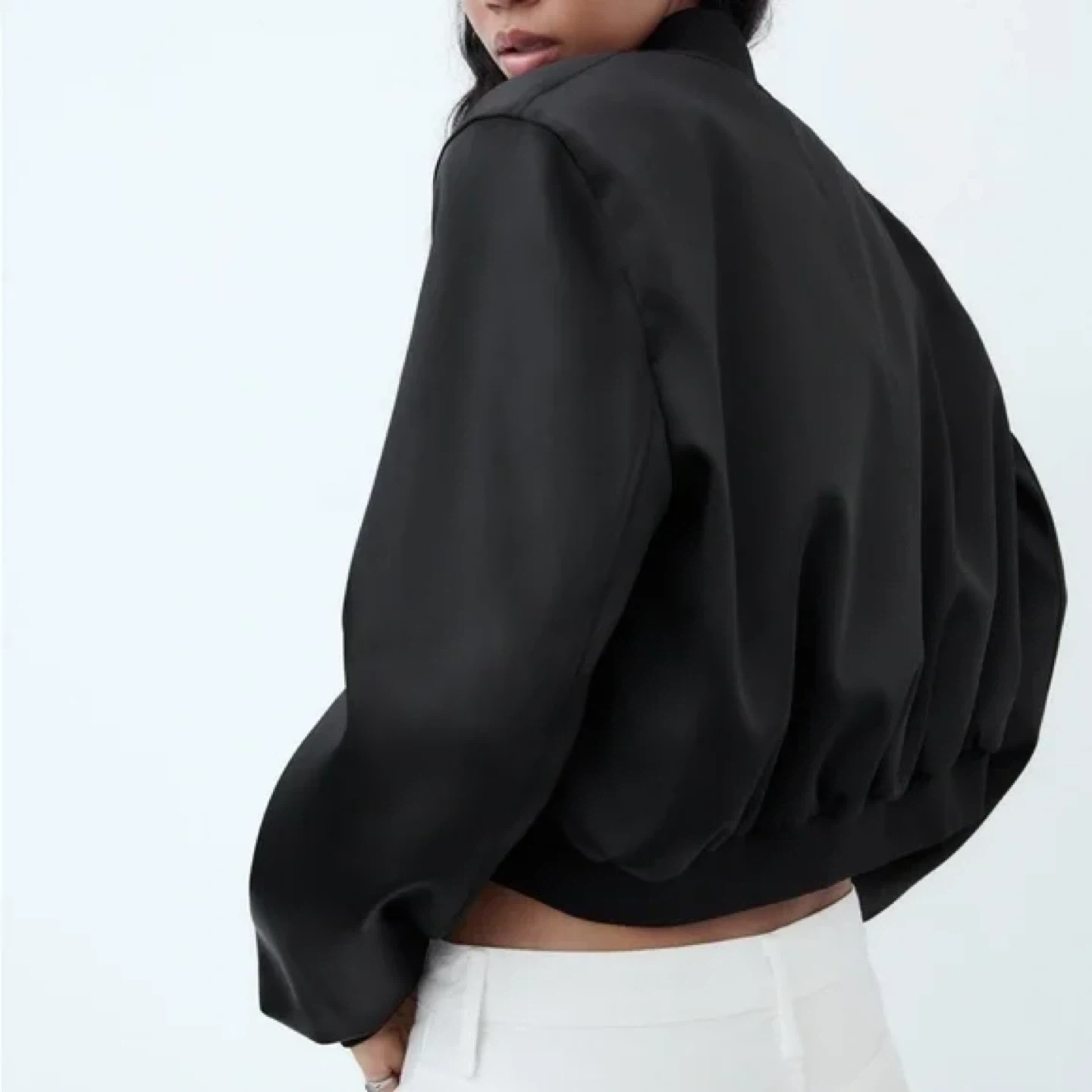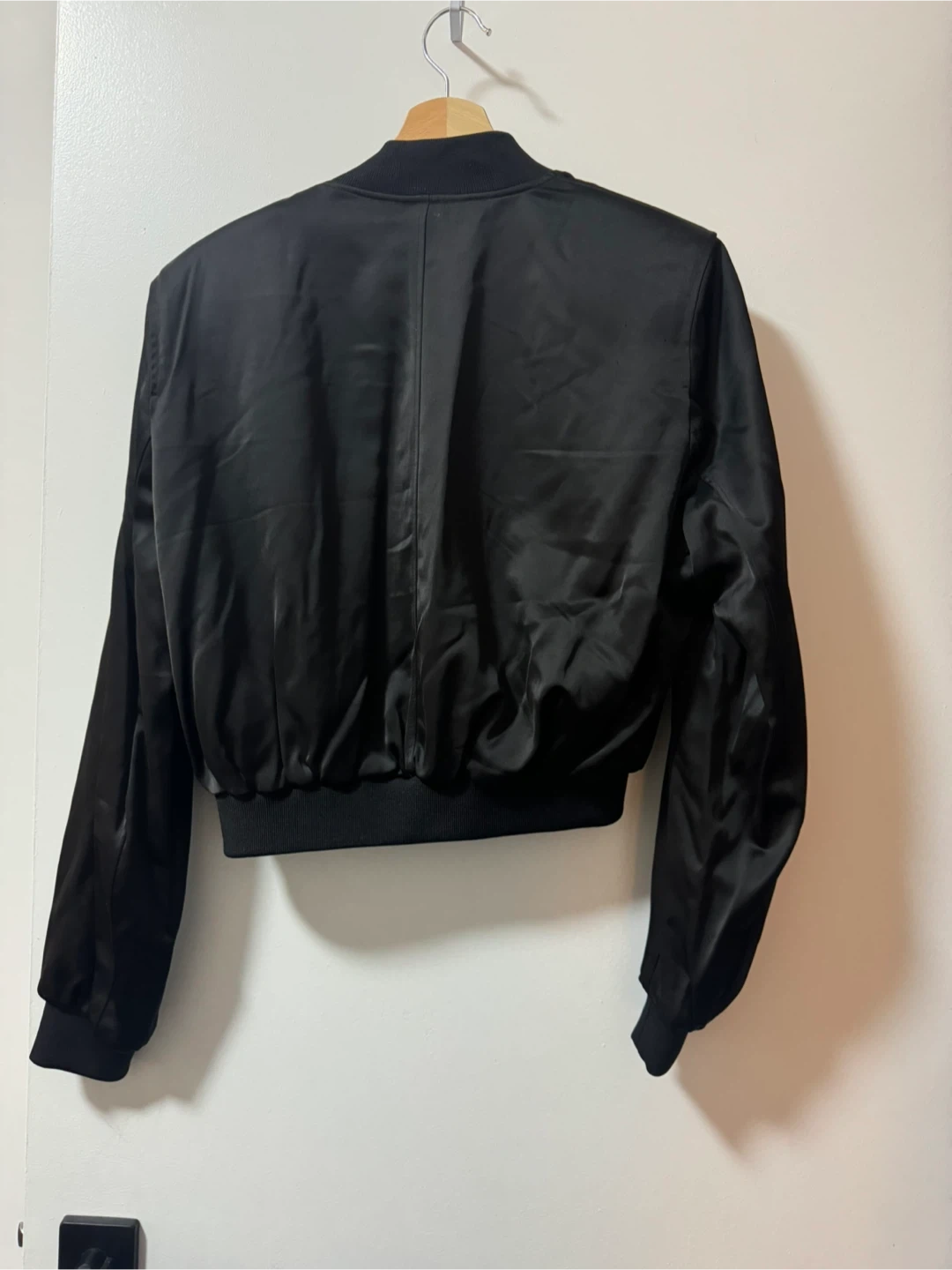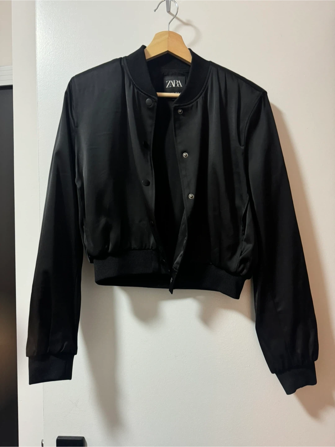 Selling a stylish black satin bomber jacket from Zara! It's in brand new condition and never been worn. The material is silky and comfortable, making it a great addition to spring/summer wardrobe