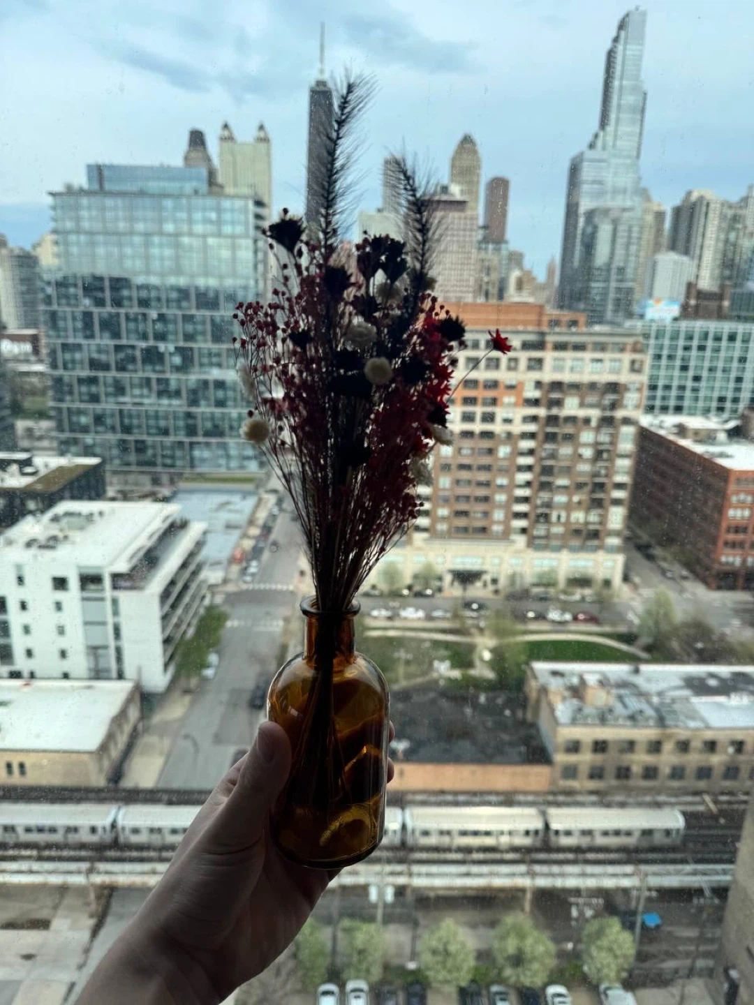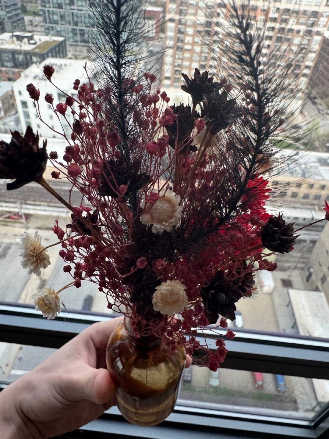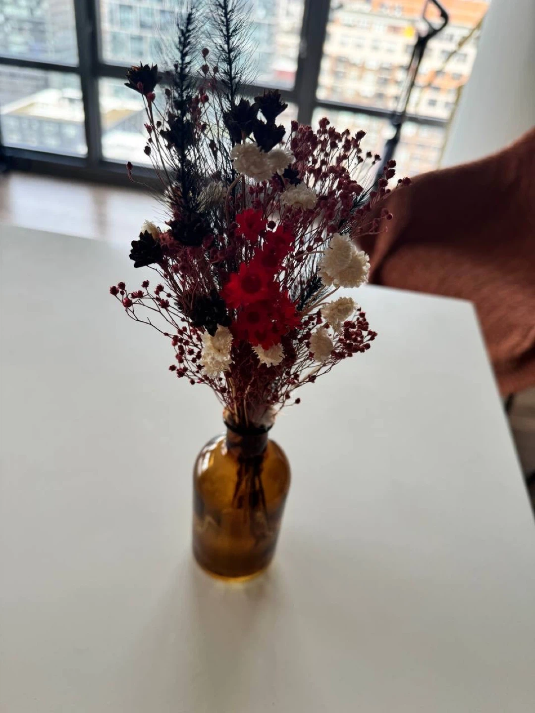 A small amber glass bottle vase filled with a mix of dried flowers and botanicals. Features red, white, and dark brown elements with pinecone accents. This decorative piece adds a touch of rustic charm to any space.