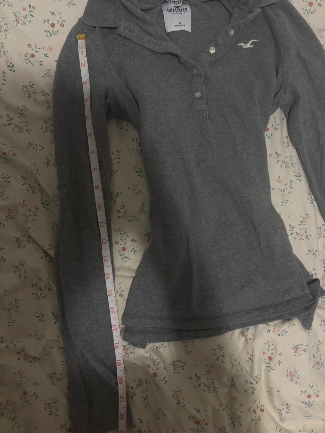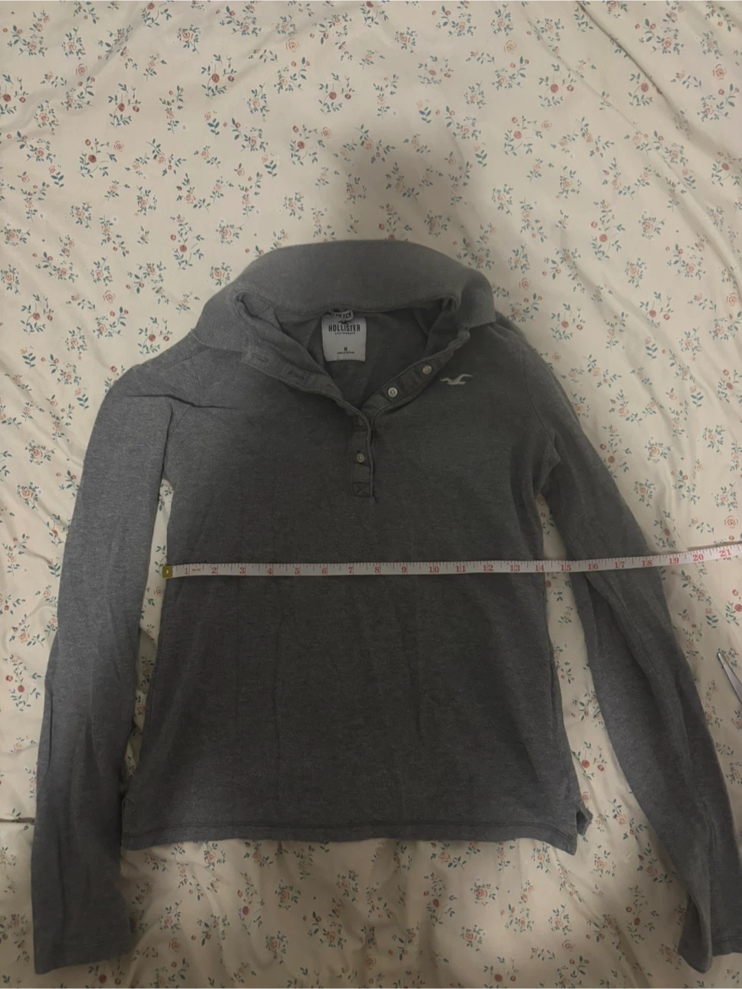 This is a grey long-sleeved hoodie from Hollister. It's a size medium with a button-up collar. Made of a soft, stretchy material.
