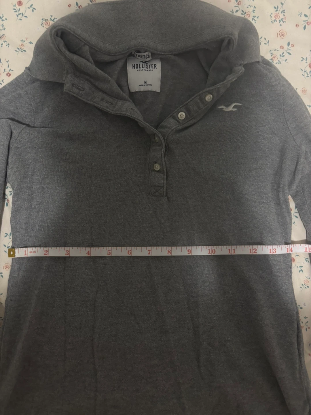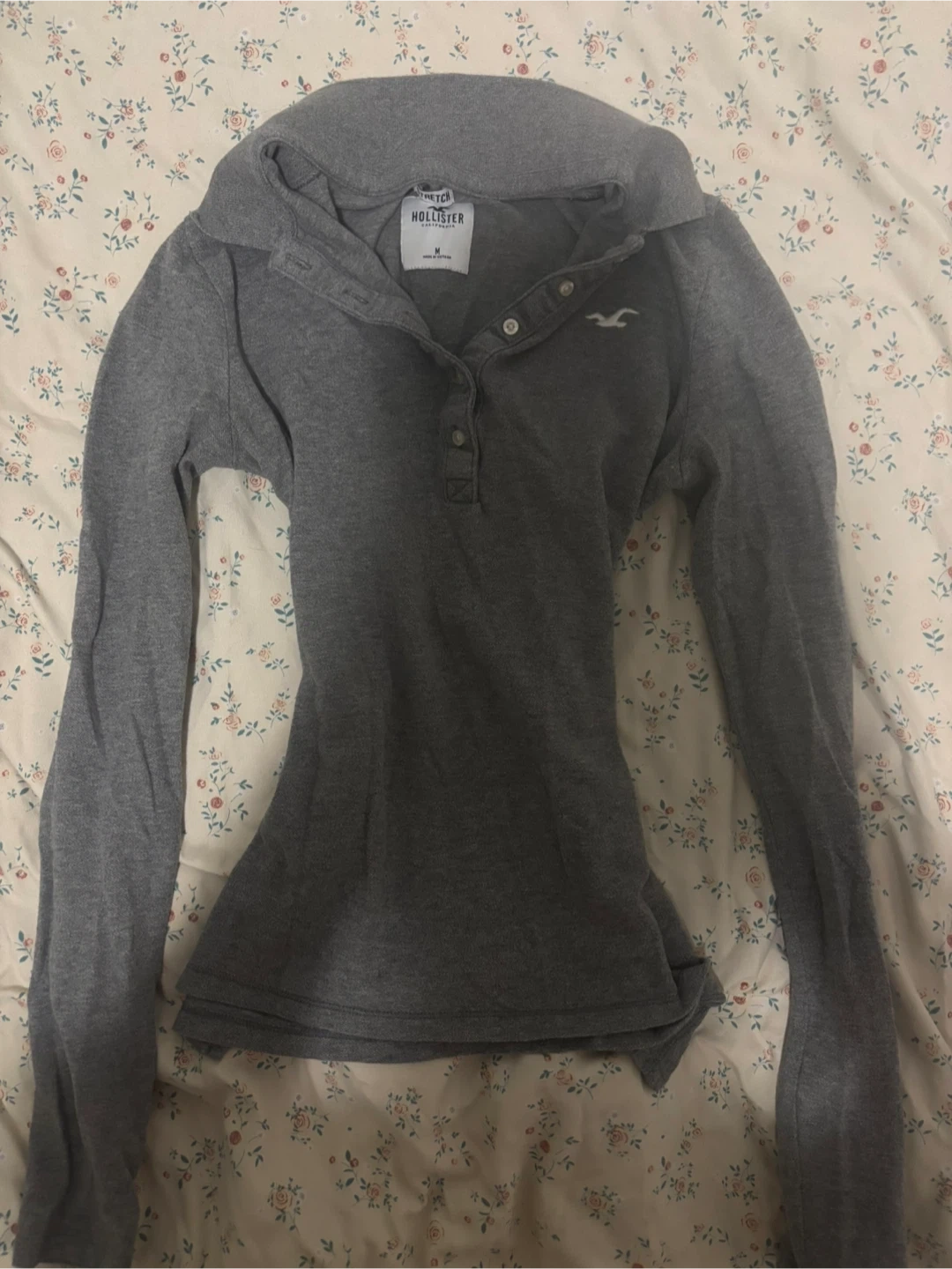 This is a grey long-sleeved hoodie from Hollister. It's a size medium with a button-up collar. Made of a soft, stretchy material.
