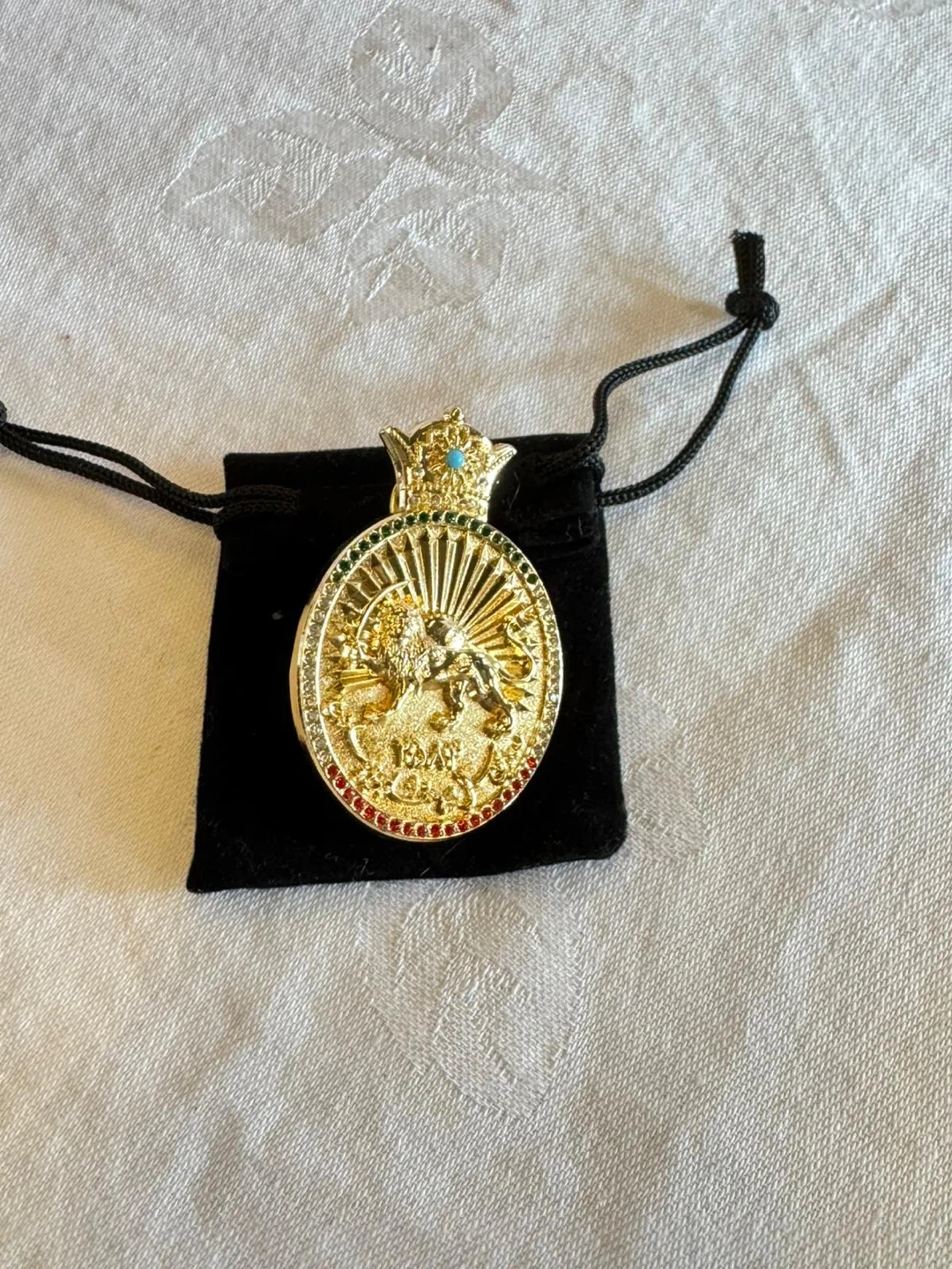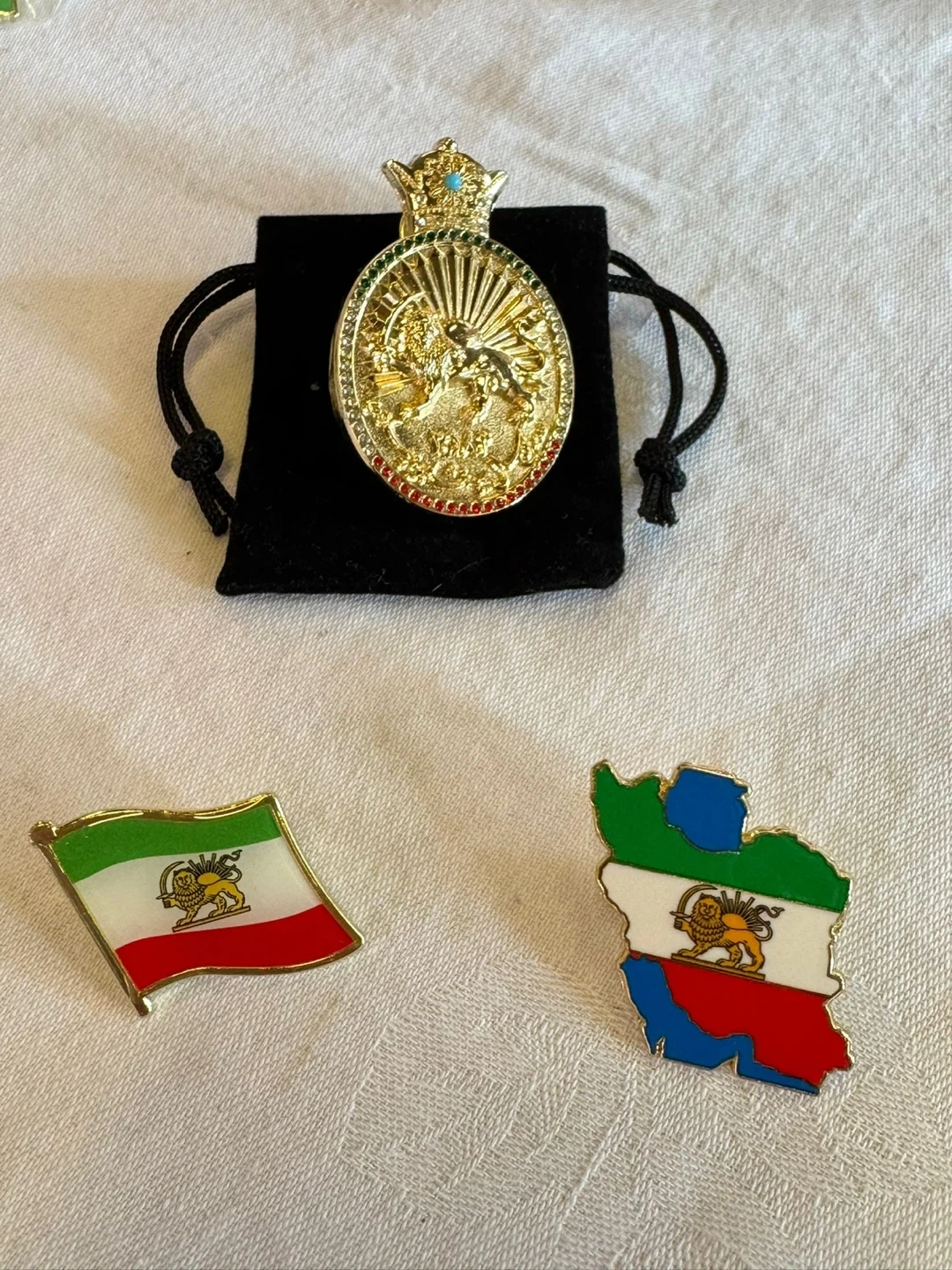 This set includes three pins: one shaped like the Iranian flag, another depicting the map of Iran with the flag colours, and a decorative oval pin featuring a lion and sun emblem, all with gold-toned metal detailing. The oval pin comes in a small black drawstring pouch. Great for showing national pride! Depends on which one you want
