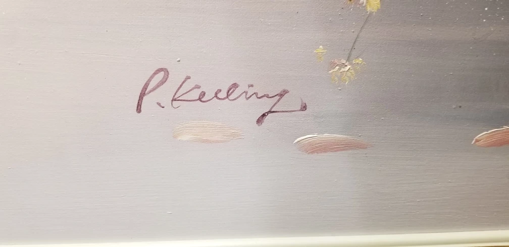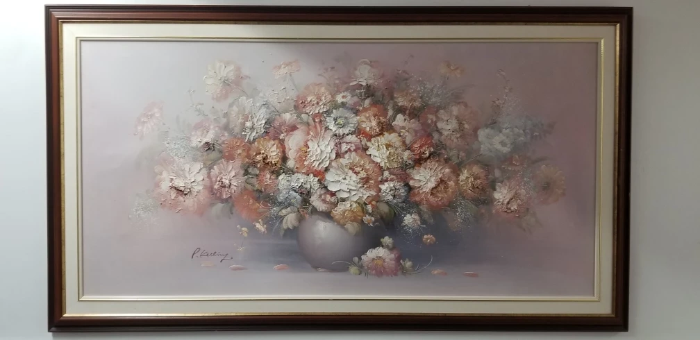 Beautiful oil painting of flowers in a vase. Large framed piece. Artist signature visible. Great for home decor.