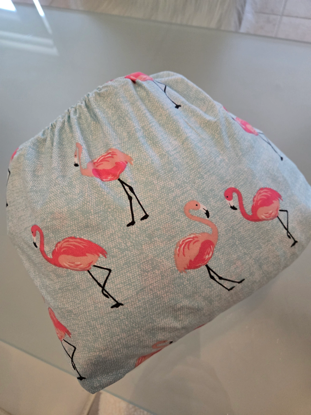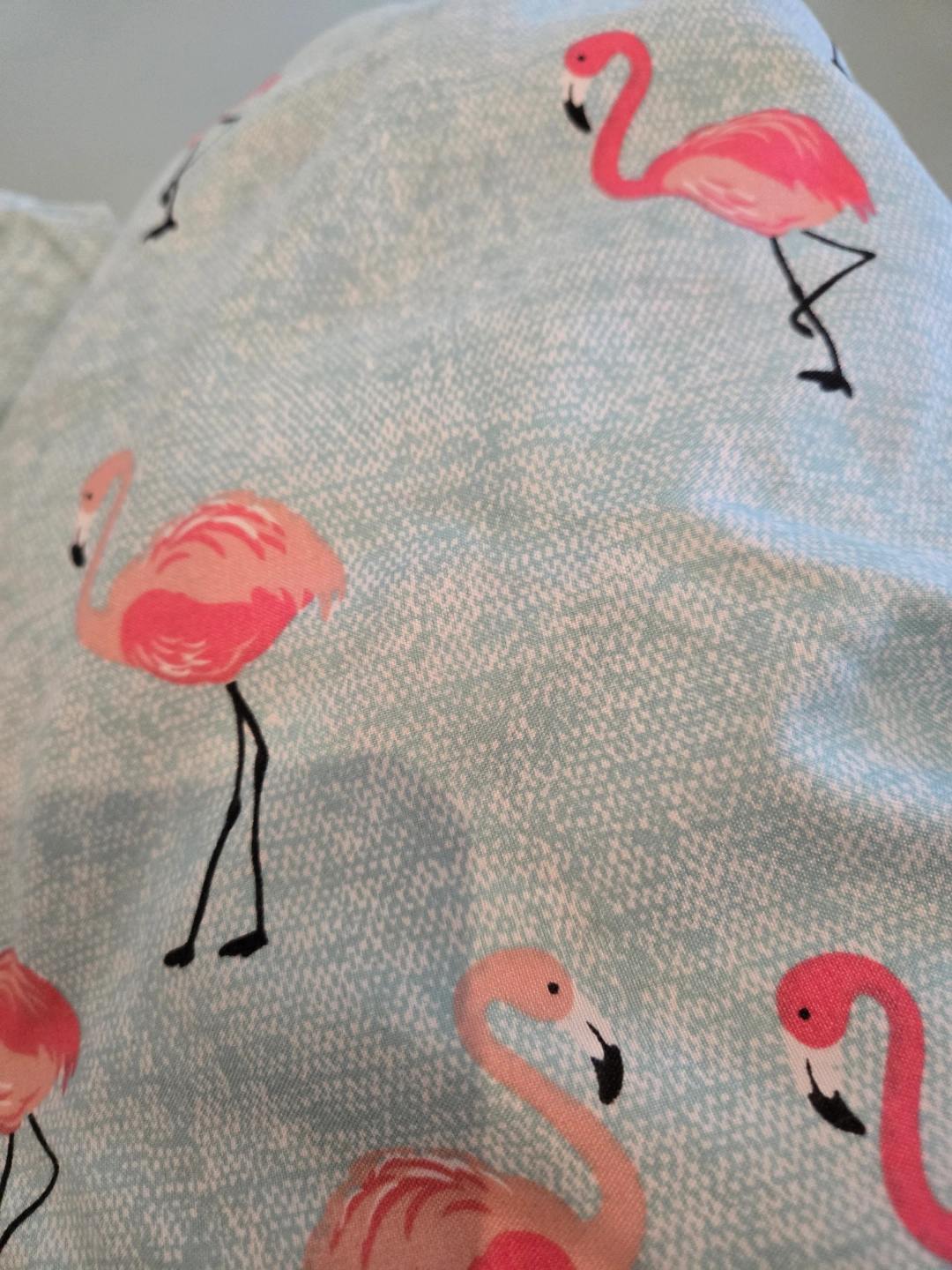 Twin size sheet set. Light blue background. Pink flamingo print. Includes fitted sheet and flat sheet, and one pillowcase. Excellent condition.