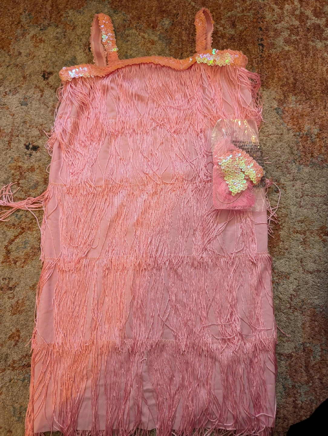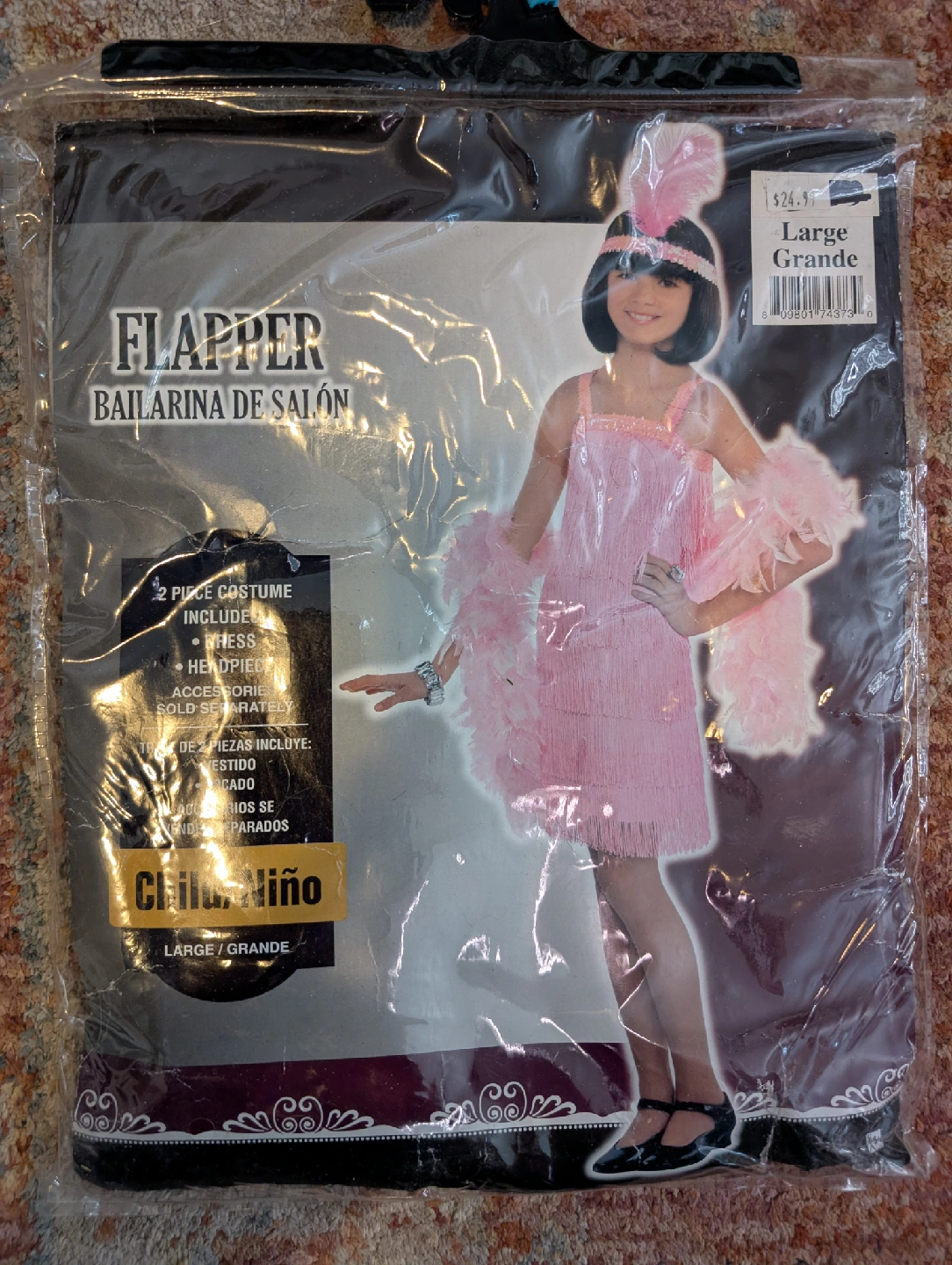 60Selling a flapper costume in size large. It's a 2-piece costume that includes the dress and a headpiece. It's a child's size large.