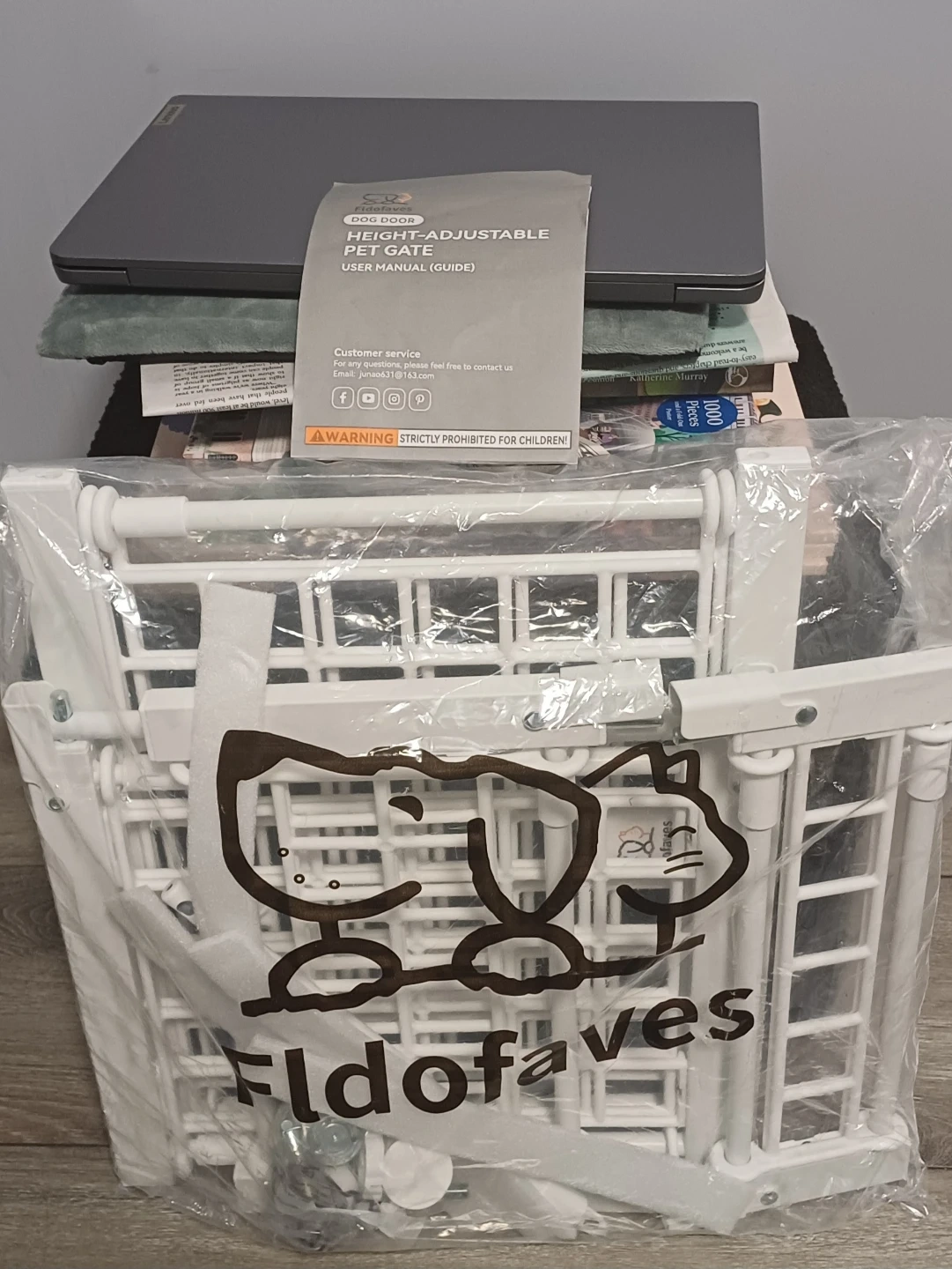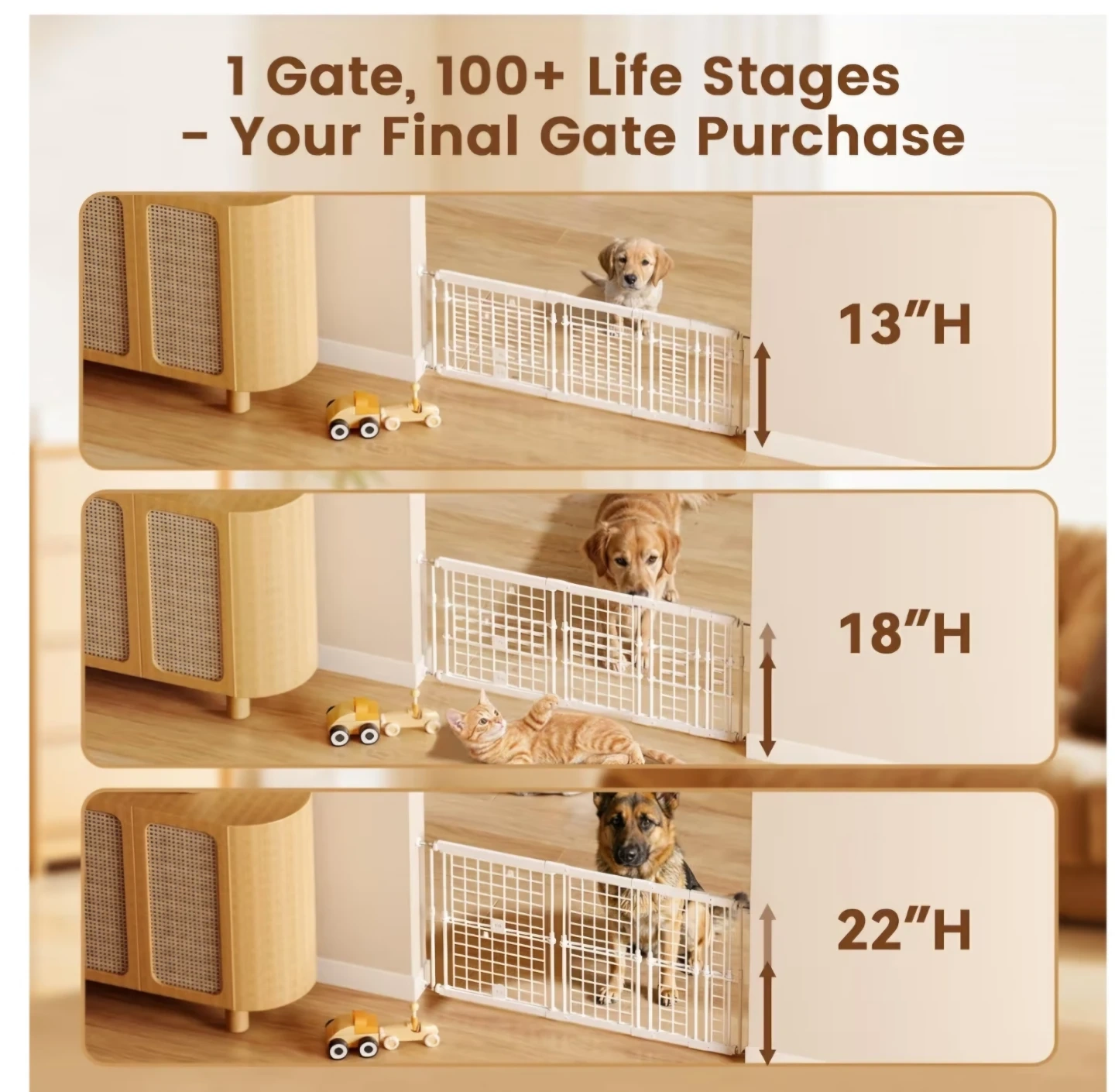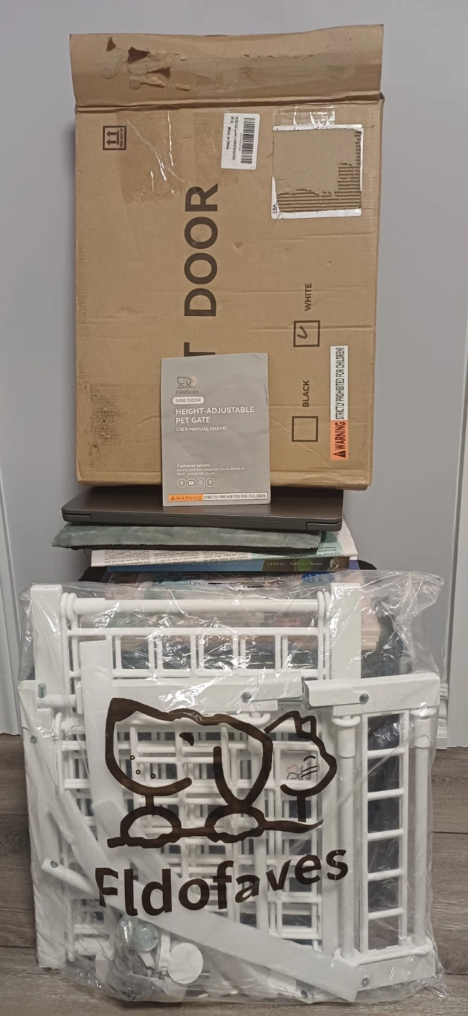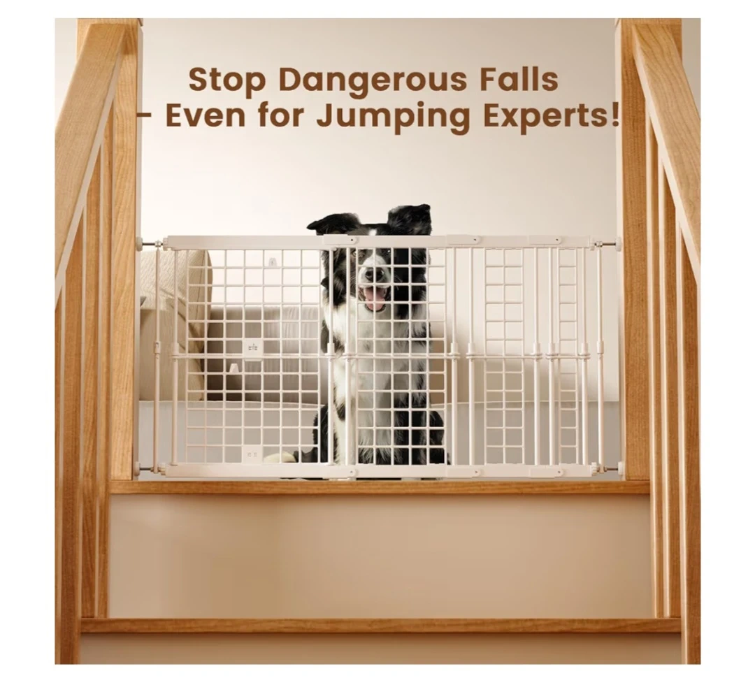 28Fldofaves height adjustable pet gate in white! It's designed to fit various openings and can be adjusted to different heights (13", 18", and 22"). No Drill Pet Gate for Doorways, Stairs. This gate is perfect for keeping your furry friends safe and secure. The original box and user manual are included!