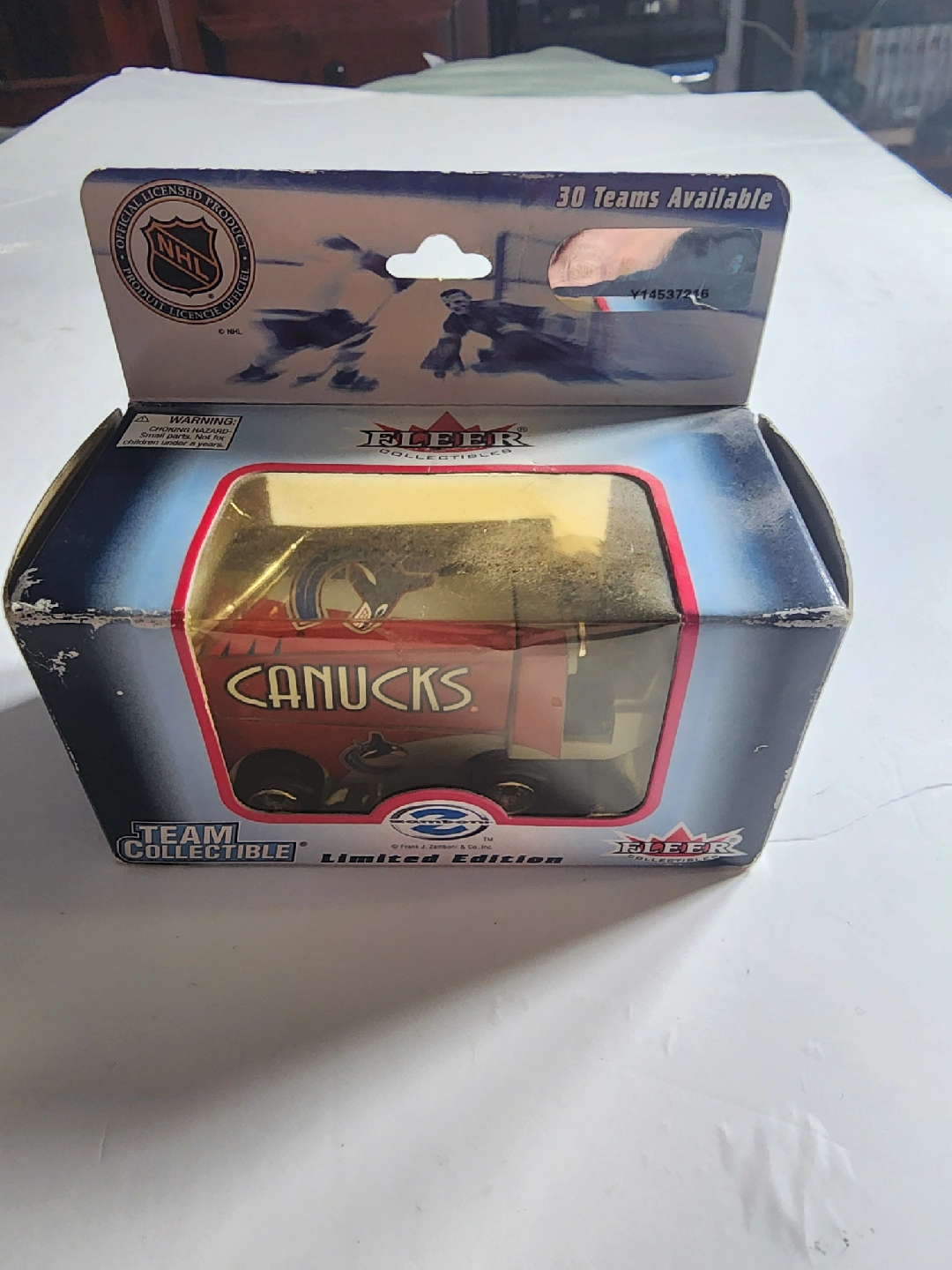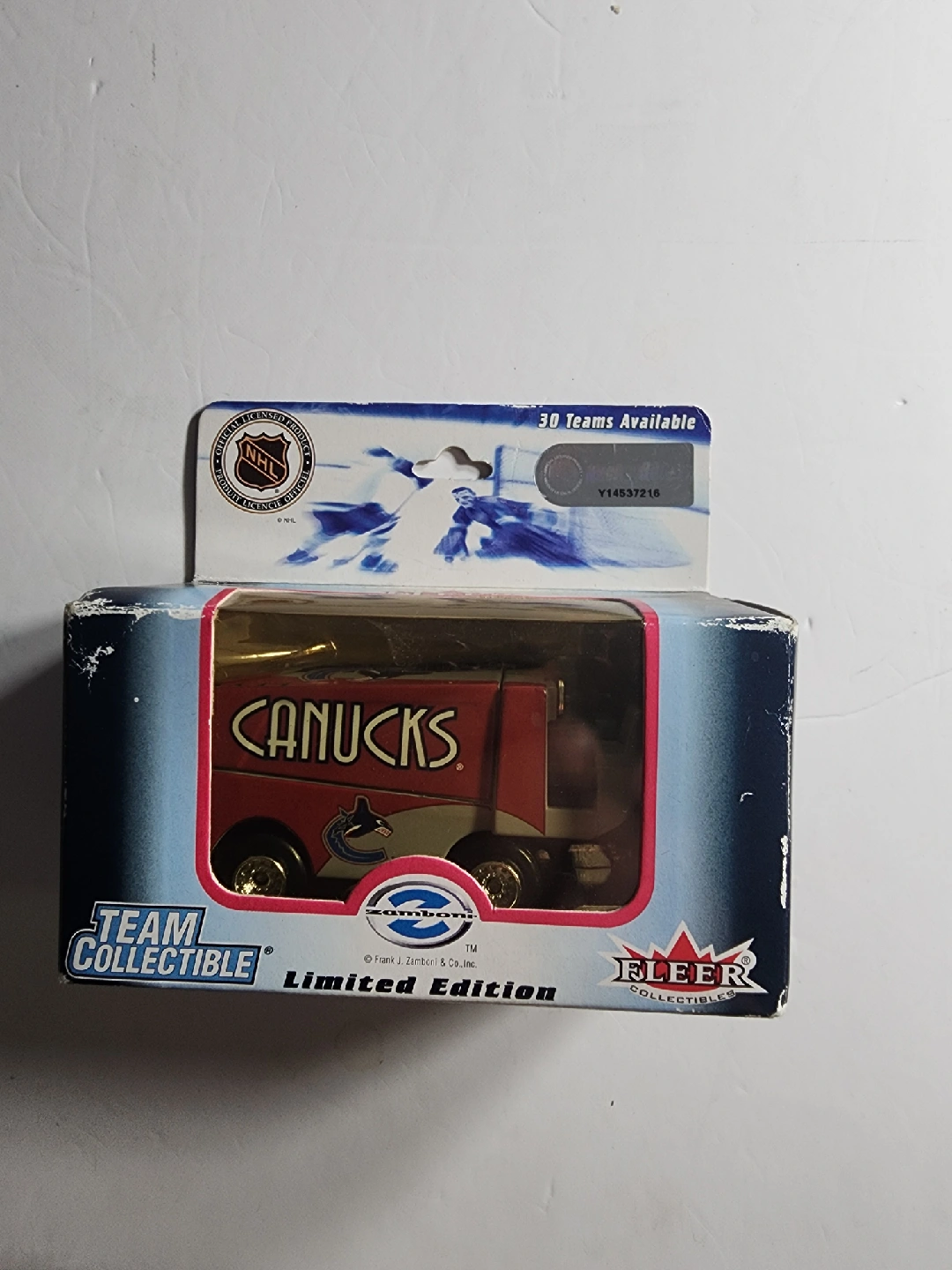 Selling a Fleer Collectibles Limited Edition Team Collectible Zamboni Ice Resurfacing Machine featuring the Vancouver Canucks! It's a 1:50 scale die-cast collectible. The box shows some wear, but the Zamboni inside is in great shape!