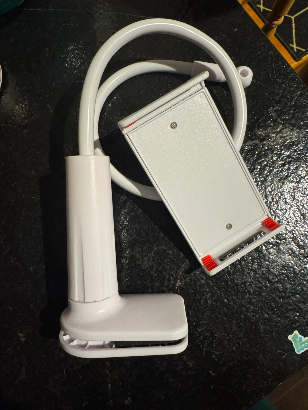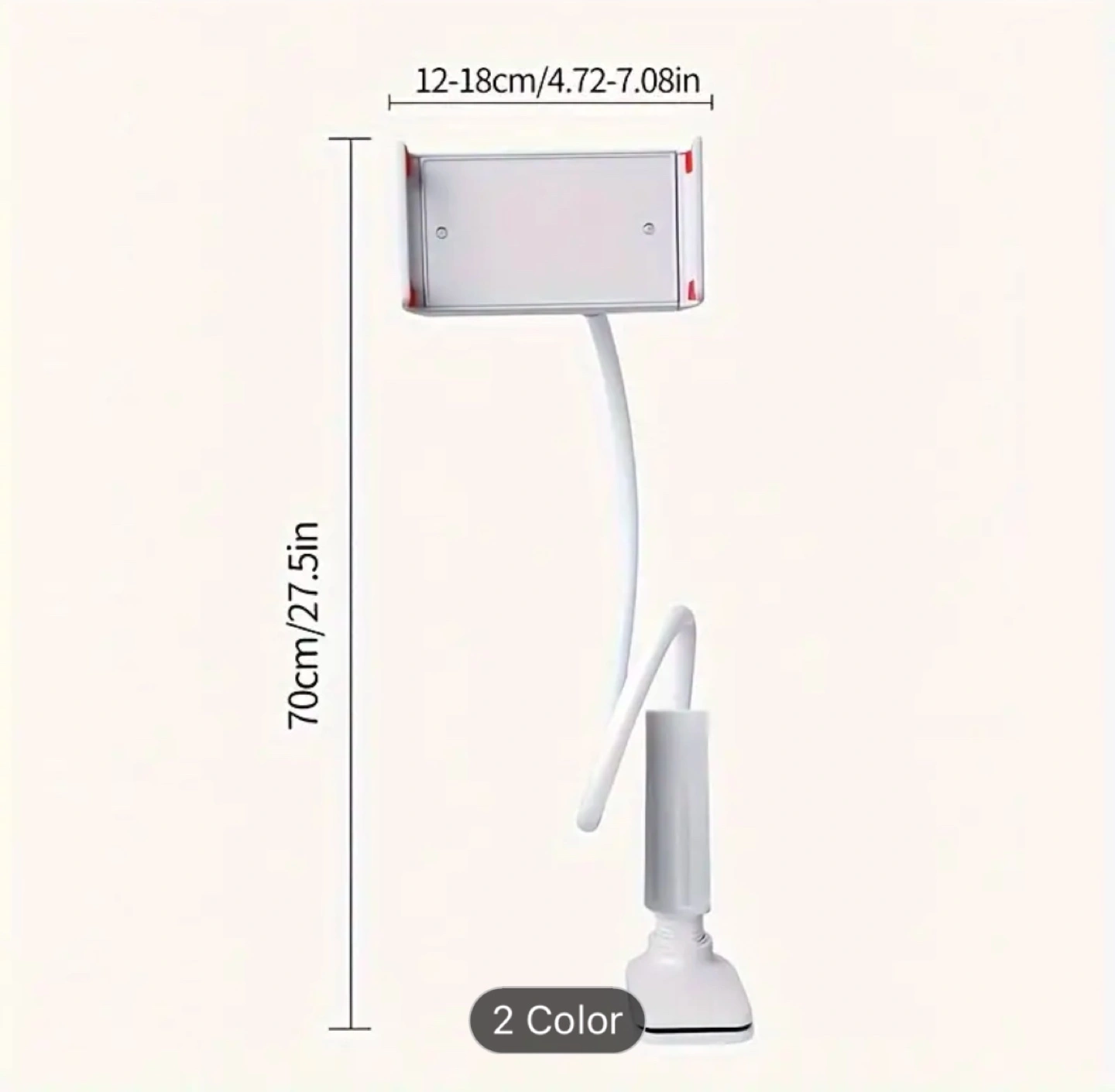Gooseneck phone holder. Attaches to surfaces. Holds phones and tablets. Great for reading or watching videos.