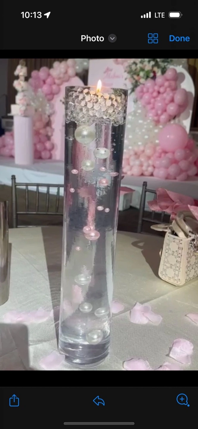Tall clear glass cylinder. Contains water and floating pearls. Perfect centerpiece for events. 24 pieces