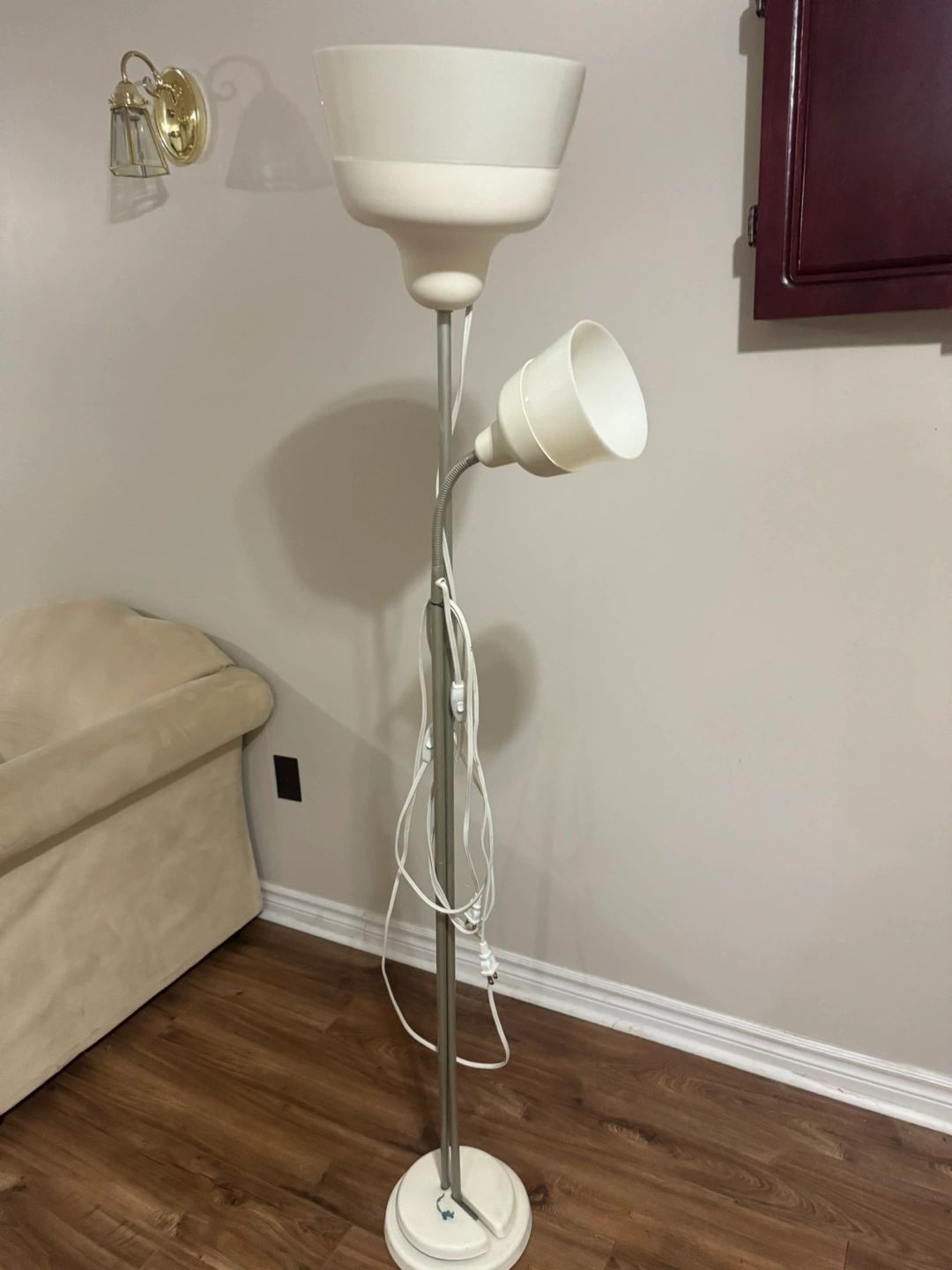 180Floor lamp with two white shades. One shade is larger than the other. The lamp has a silver metal stand and a white base. The price has already been set low. If interested just message the time for pickup.