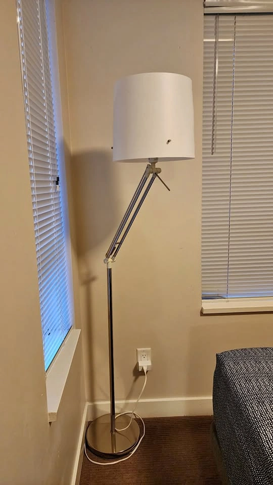 33Pick up at 3565 Wesbrook Mall - UBC - Vancouver. Modern adjustable floor lamp with white fabric shade. Sleek chrome finish, works well.