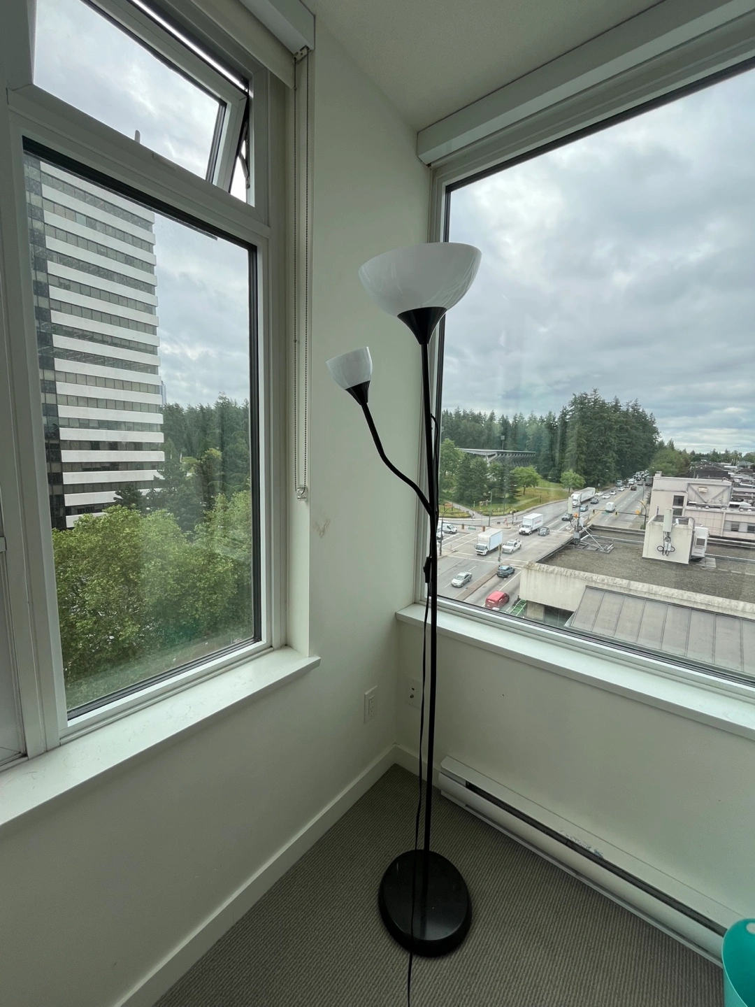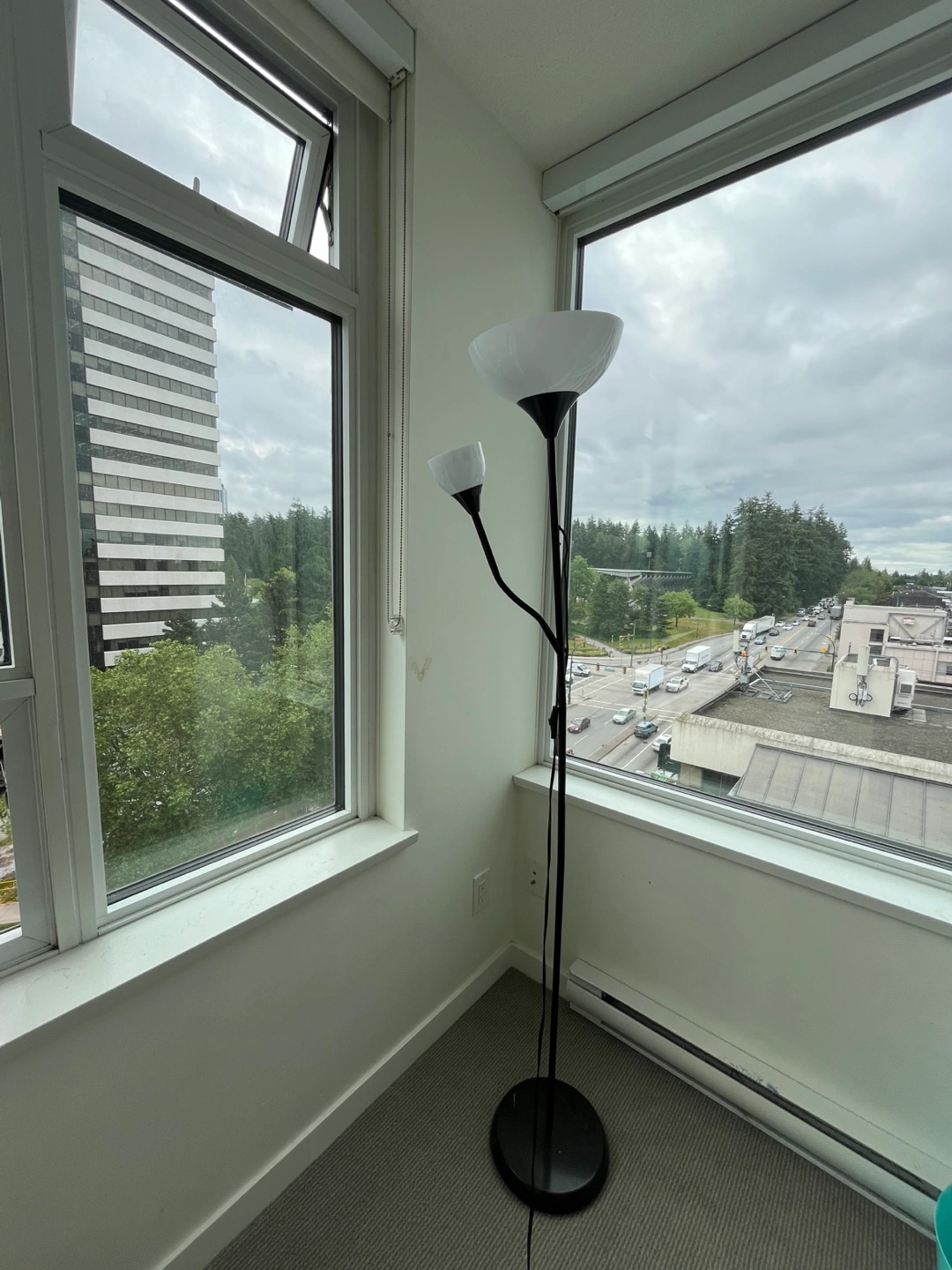19Floor lamp, a black metal frame. Features two lights. The lamp shades are white. Ideal for reading a good book.