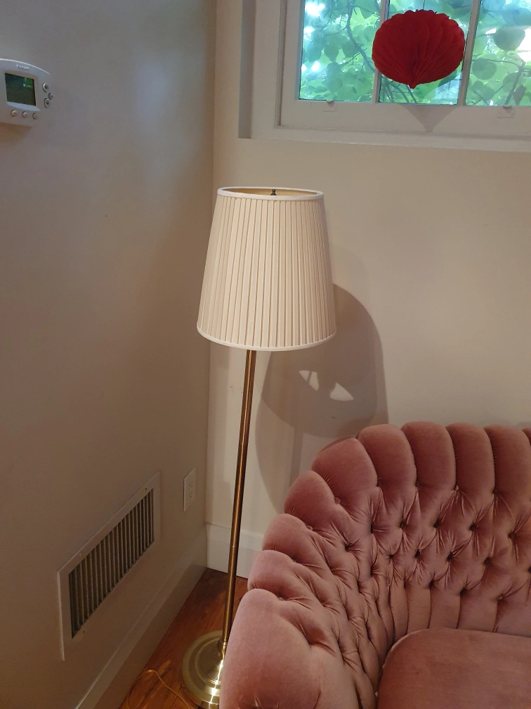 Floor lamp with pleated lampshade and gold finish. A perfect addition for any reading nook, it creates a comforting ambience when lit.