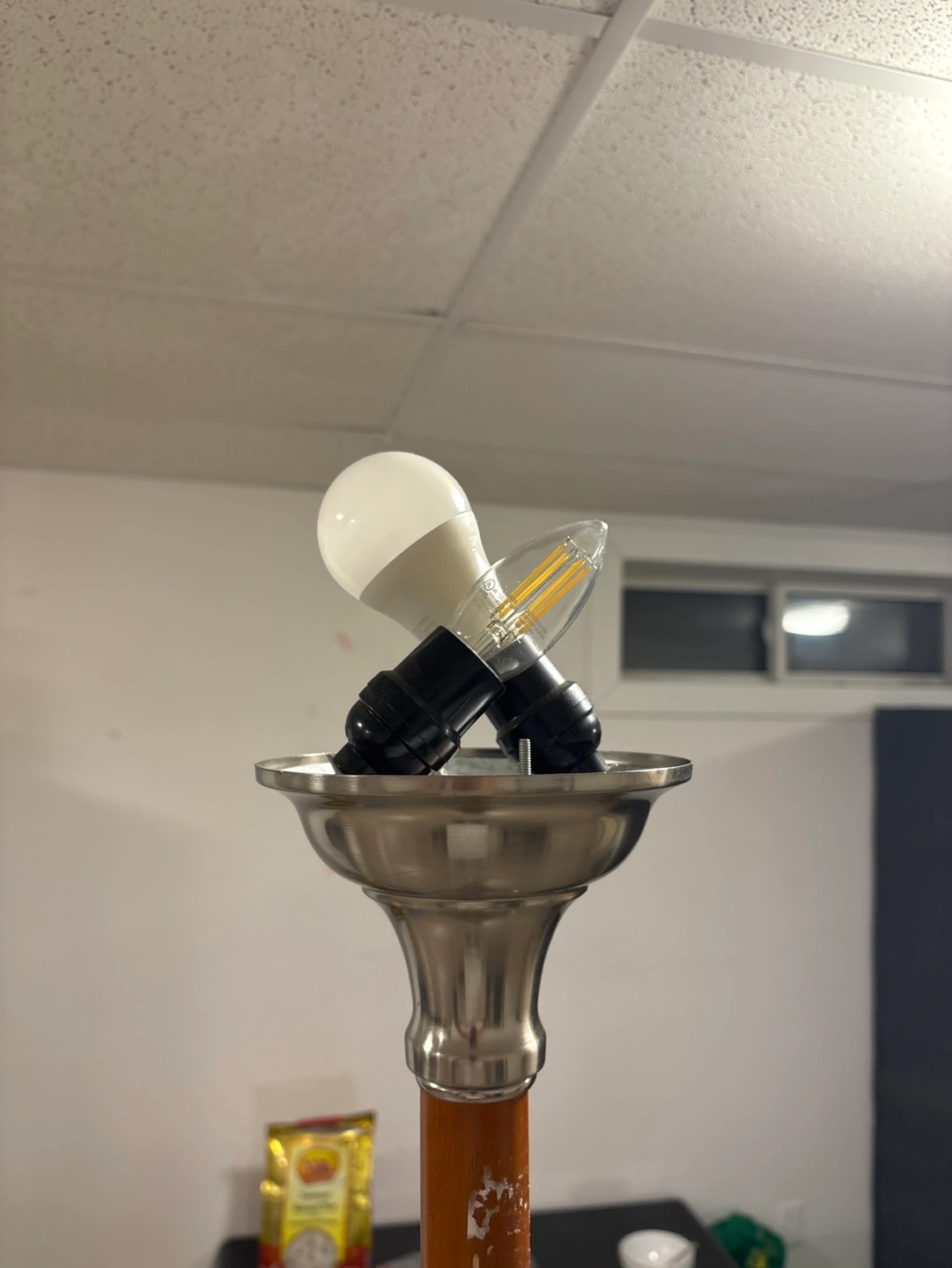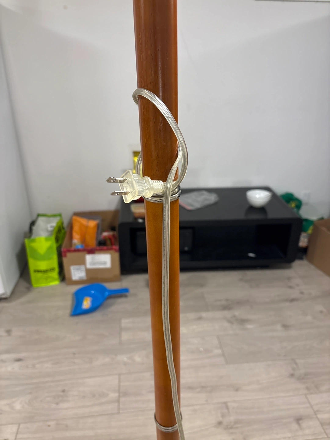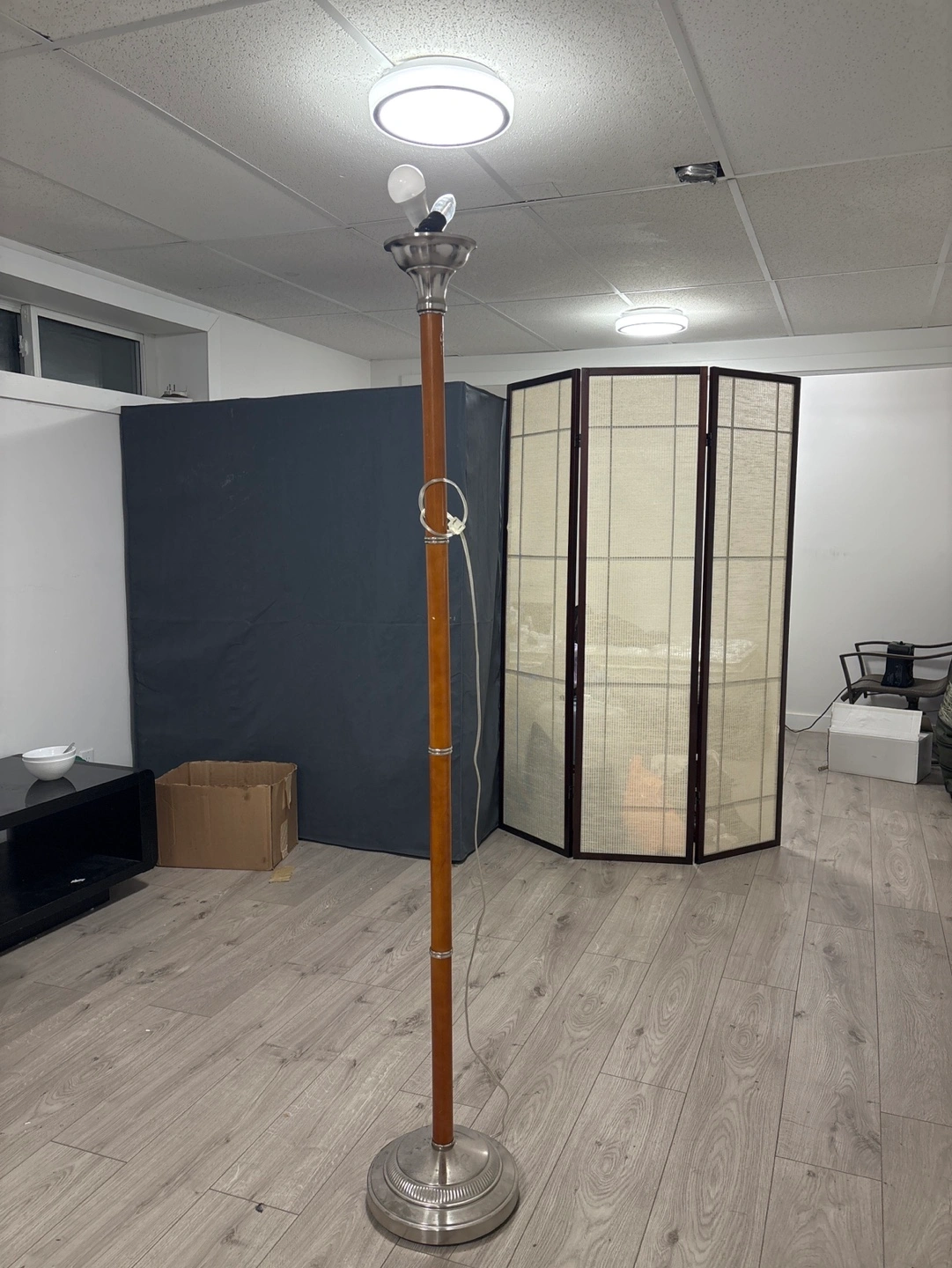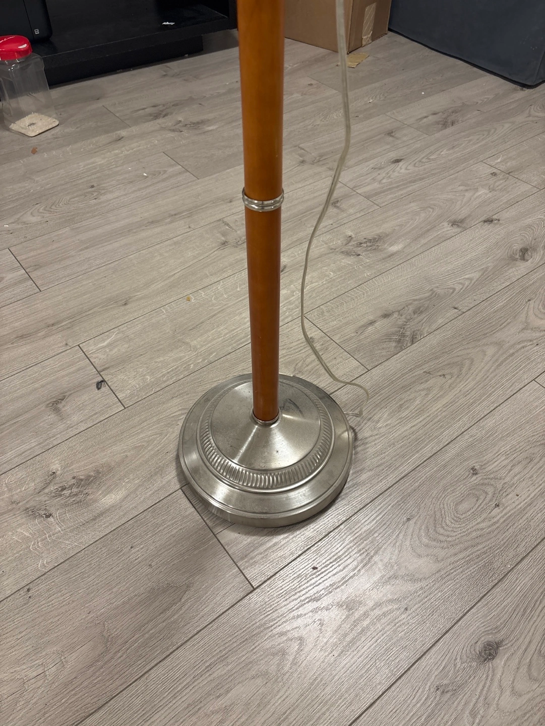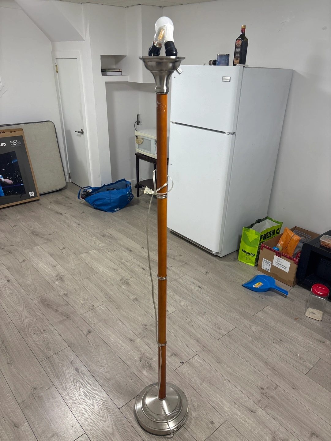 15Tall floor lamp with wooden pole and silver accents. Has two lightbulb sockets.