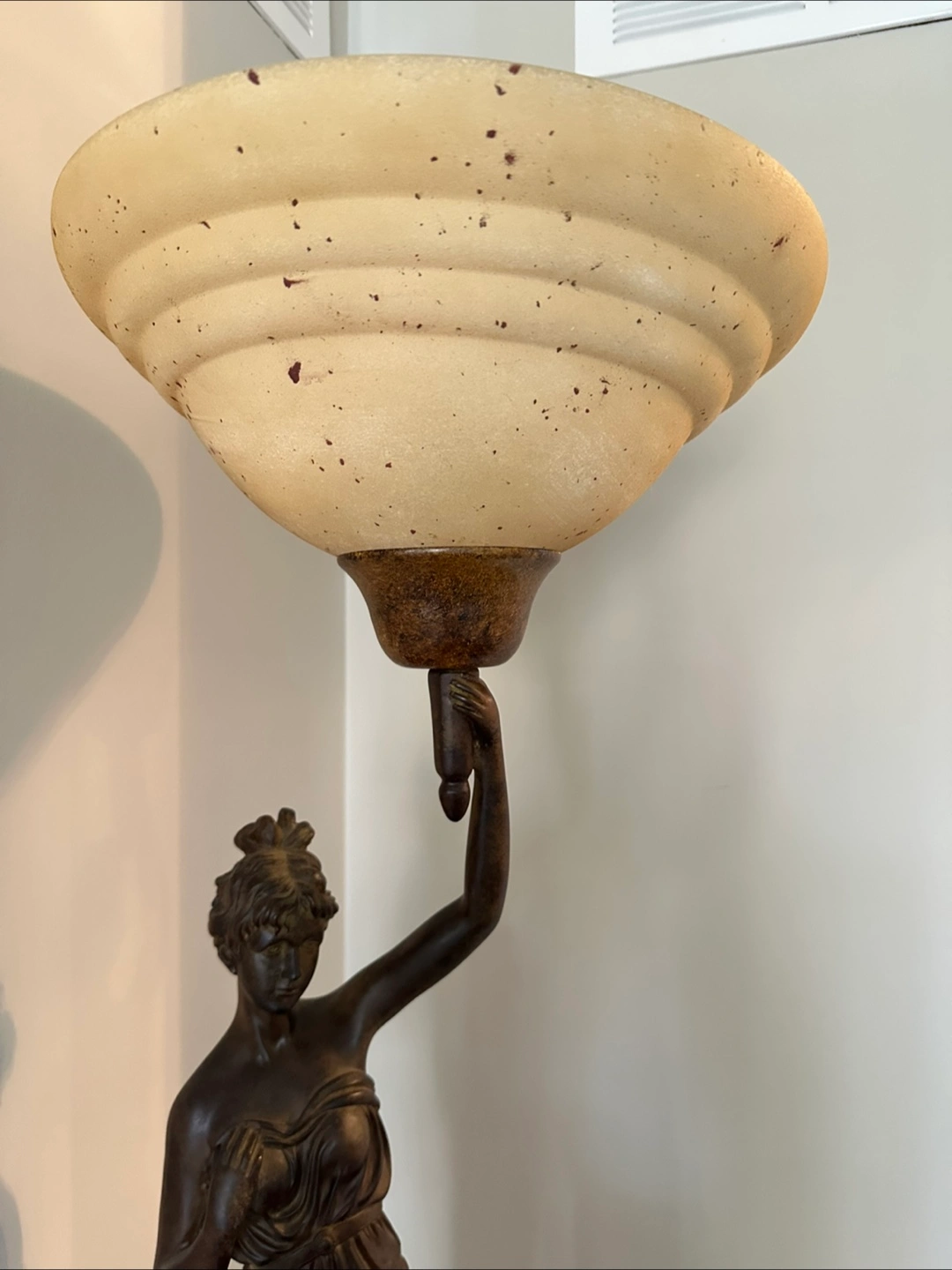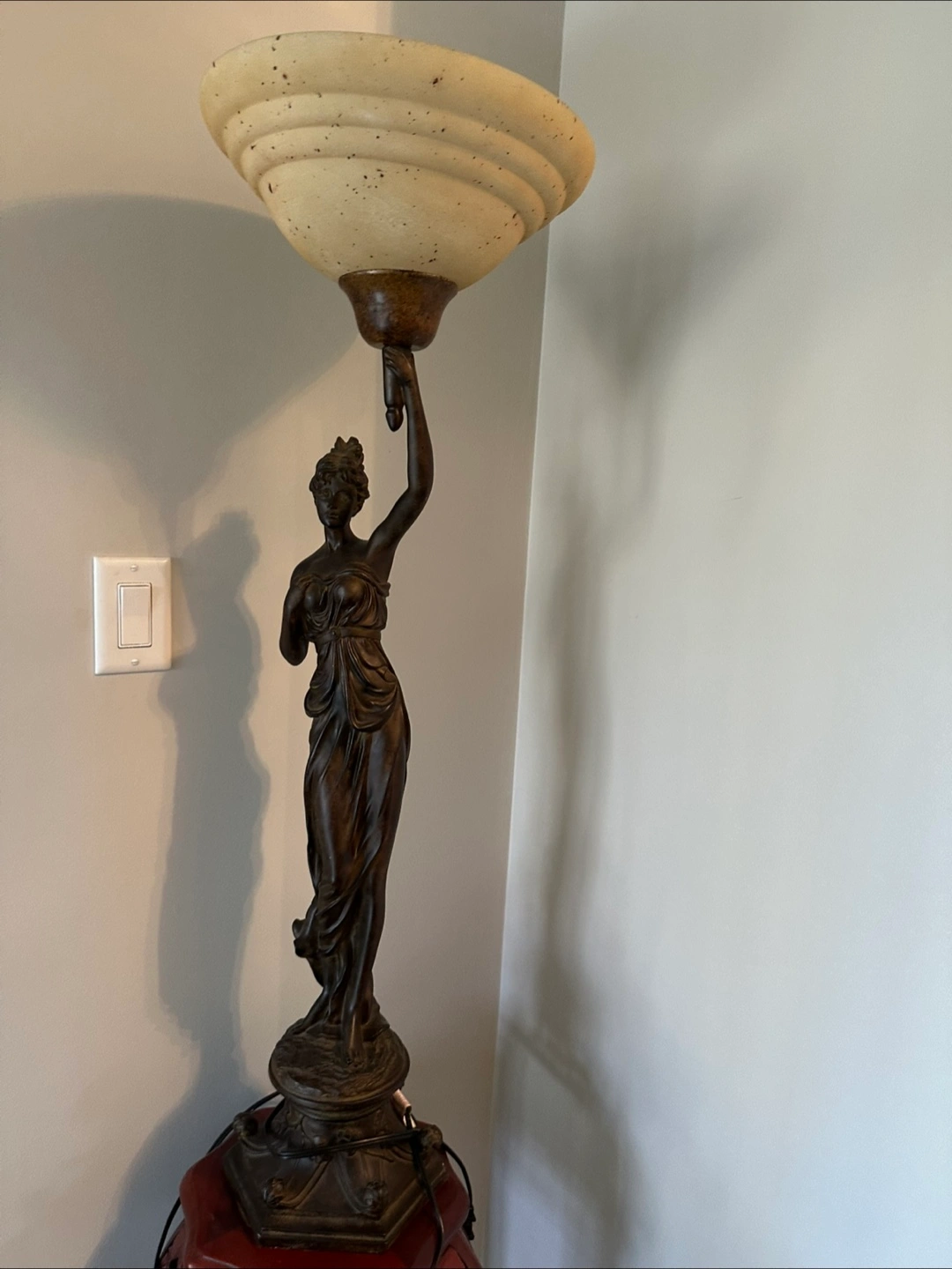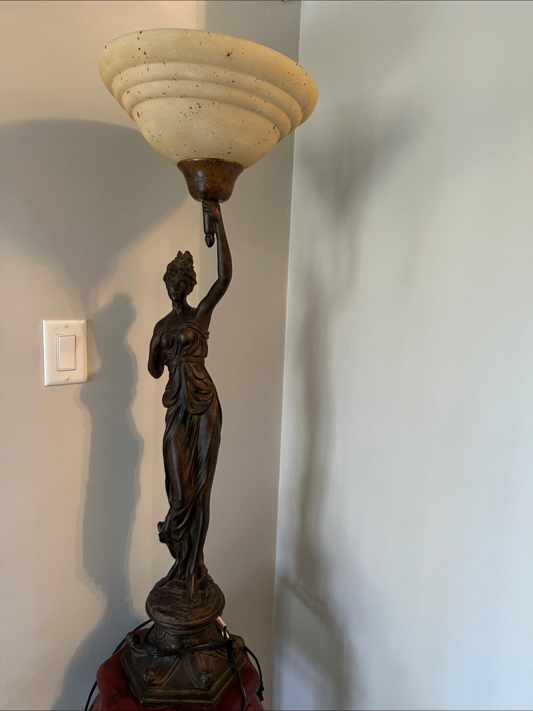 Elegant floor lamp features a bronze-coloured female statue holding a large, off-white lampshade. Dark brown base. Unique and stylish piece. Suitable for living room or bedroom.
