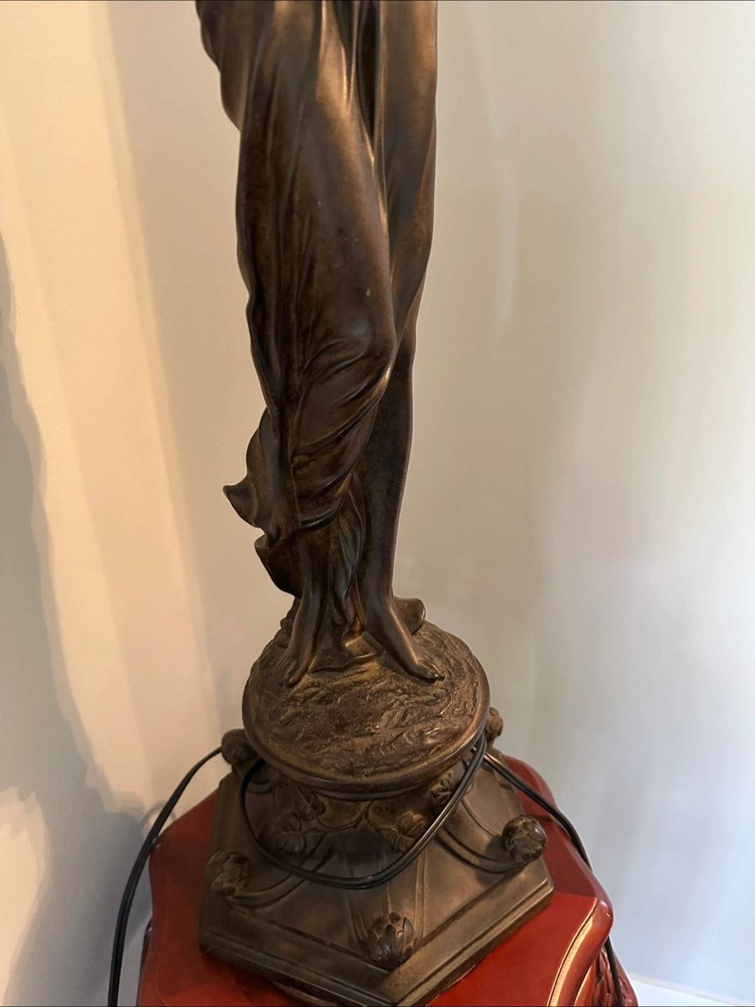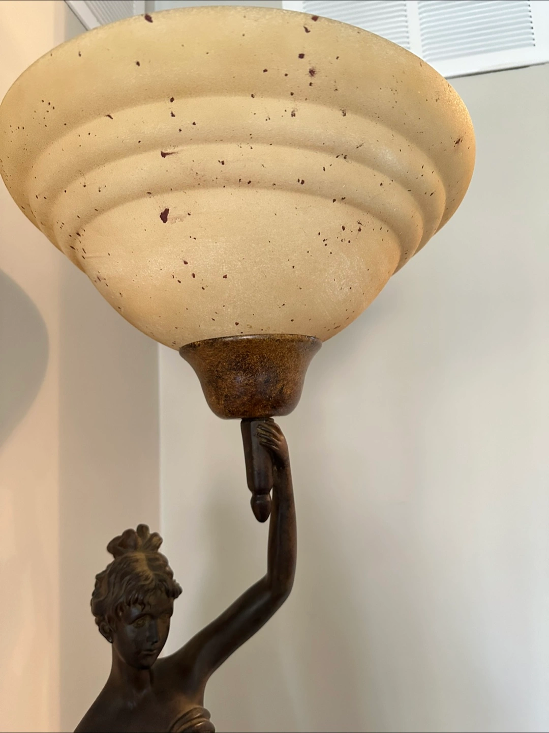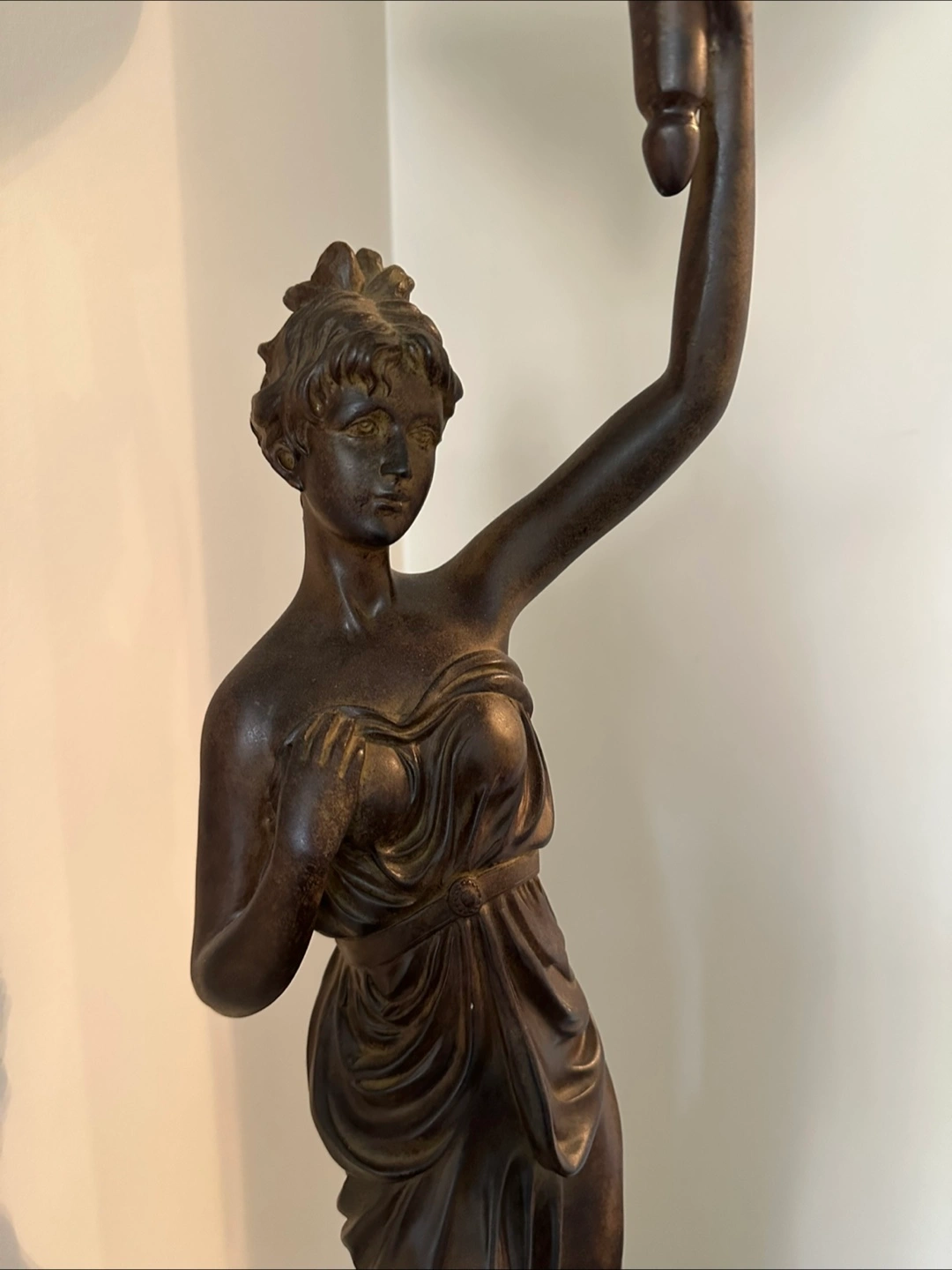 Elegant floor lamp features a bronze-coloured female statue holding a large, off-white lampshade. Dark brown base. Unique and stylish piece. Suitable for living room or bedroom.