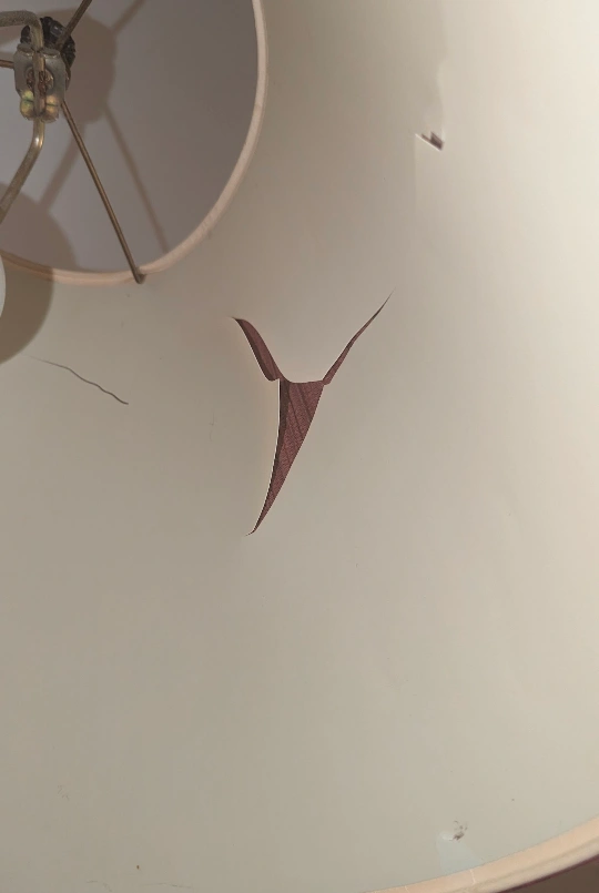 614Floor lamp with a burgundy shade. There is a tear on the shade, as pictured, but it's on the inside so not visible from the outside.