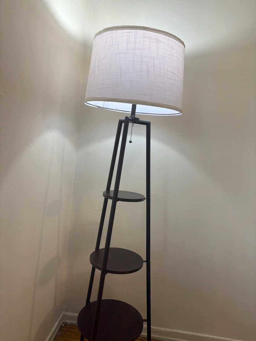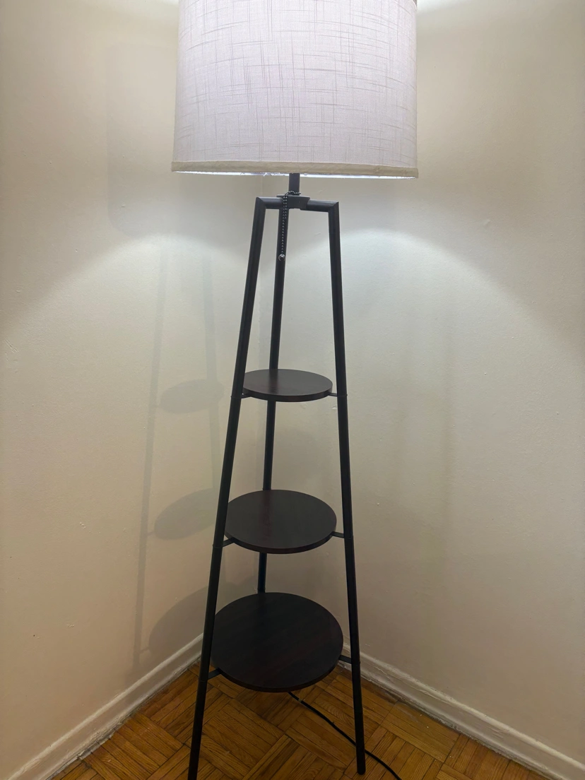 10Looking to brighten up your space? I'm selling a floor lamp with built-in shelves! It features a sleek black metal frame and a white lampshade. Perfect for adding both light and storage to any room
