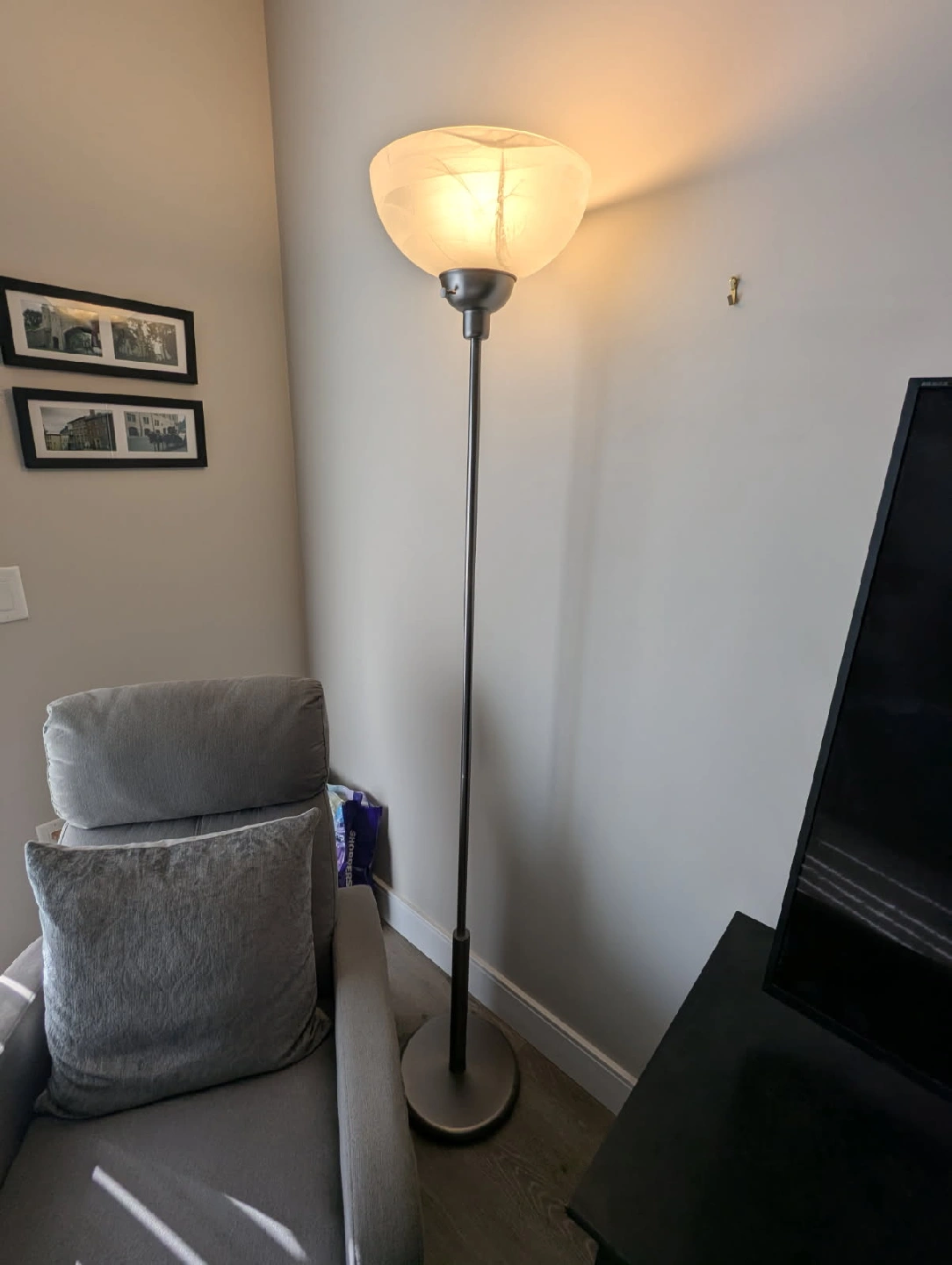 A simple floor lamp to brighten up your space! It features a sleek design with a white shade that provides a soft glow. Perfect for any room in your home. 3 adjustable brightness levels. Not a cheap Walmart lamp.