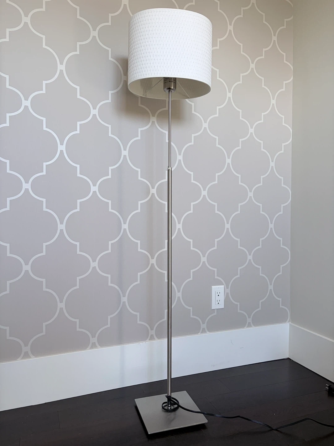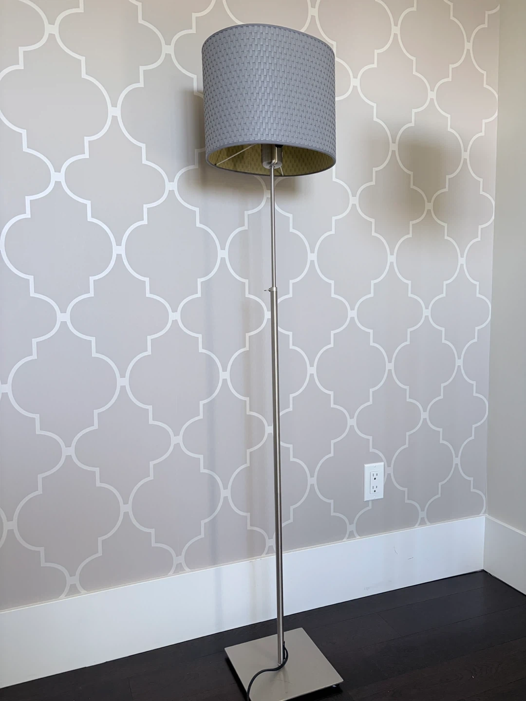 18Two Floor lamps with a grey and white woven-look shade. They have a sleek, modern design with a square base and a slim, adjustable metal pole. Great for adding some extra light to any room! Sold as a set.