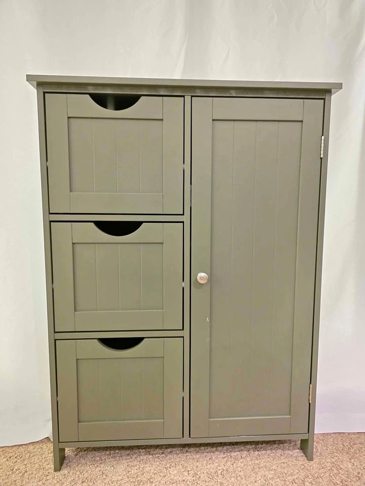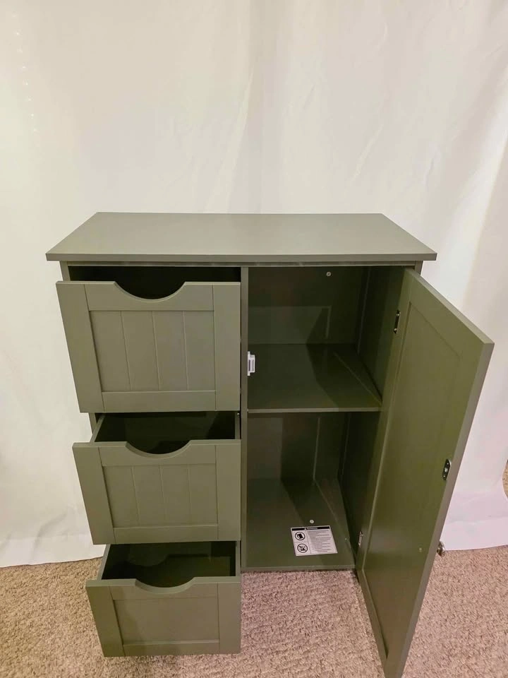 49Stylish freestanding storage cabinet with 3 drawers and 1 adjustable shelf behind a door — perfect for organizing towels, toiletries, and essentials. Compact yet spacious design that fits well in bathrooms, bedrooms, or laundry rooms. Available in White and Forest Green finishes. Brand new, pulled from a liquidation pallet. Retail Price: $110–$135 My Price: $80 each (Brand New)