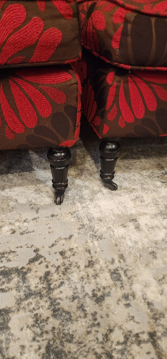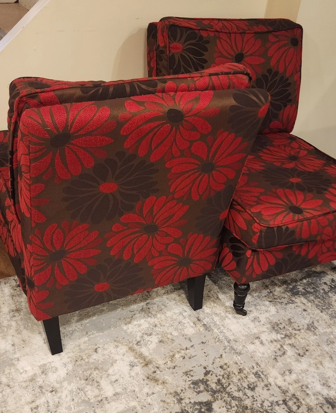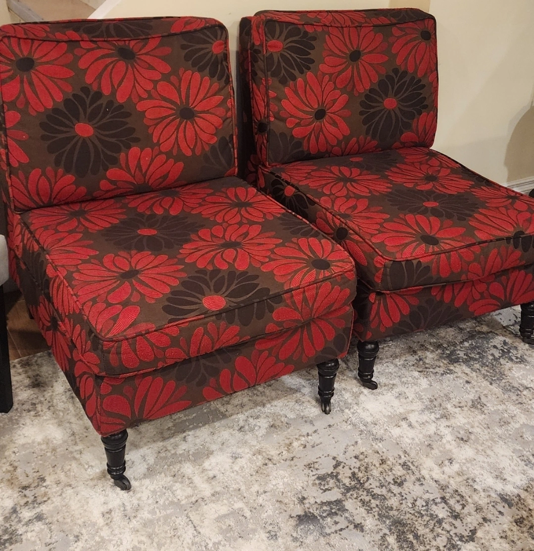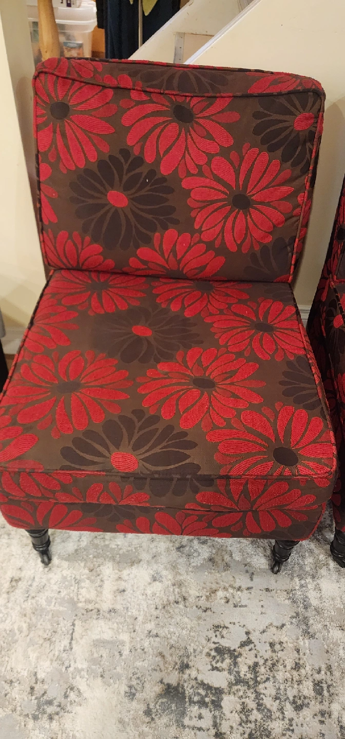 Selling a set of two accent chairs with a lovely floral pattern! The chairs feature a brown background with red and black floral designs. They have dark wooden legs, adding a touch of elegance to any room. Perfect for adding a pop of colour and style to your living space. Pick up in Scarborough (Warden and Lawrence) Asking $150 for both or best offer.