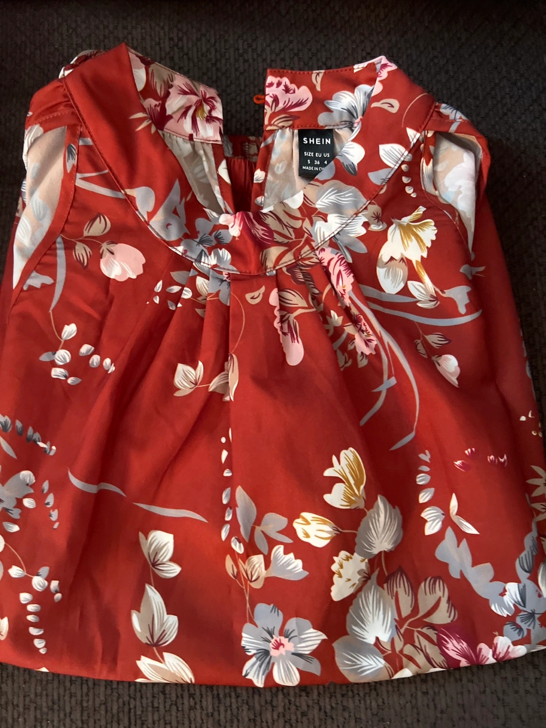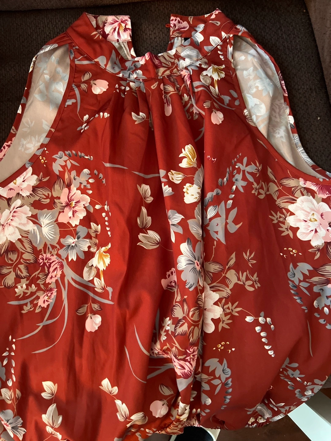 This is a lovely floral blouse in size small. It features a beautiful floral pattern on a reddish-brown background. It's in great condition and ready for a new home!