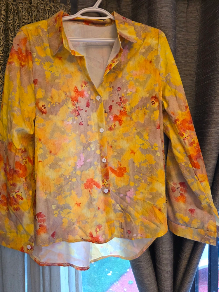 10Here's a fun floral button-up long sleeve shirt! It features a vibrant yellow and orange floral pattern. Perfect for adding a pop of colour to your wardrobe