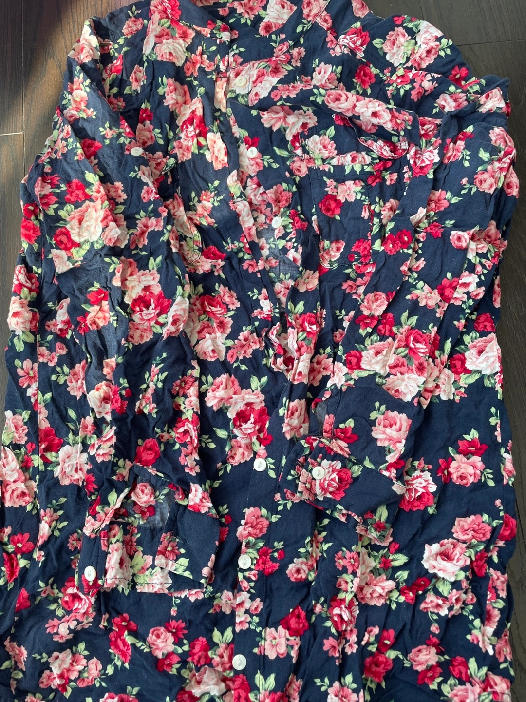 607Medium. Long sleeve button up shirt with a floral print.