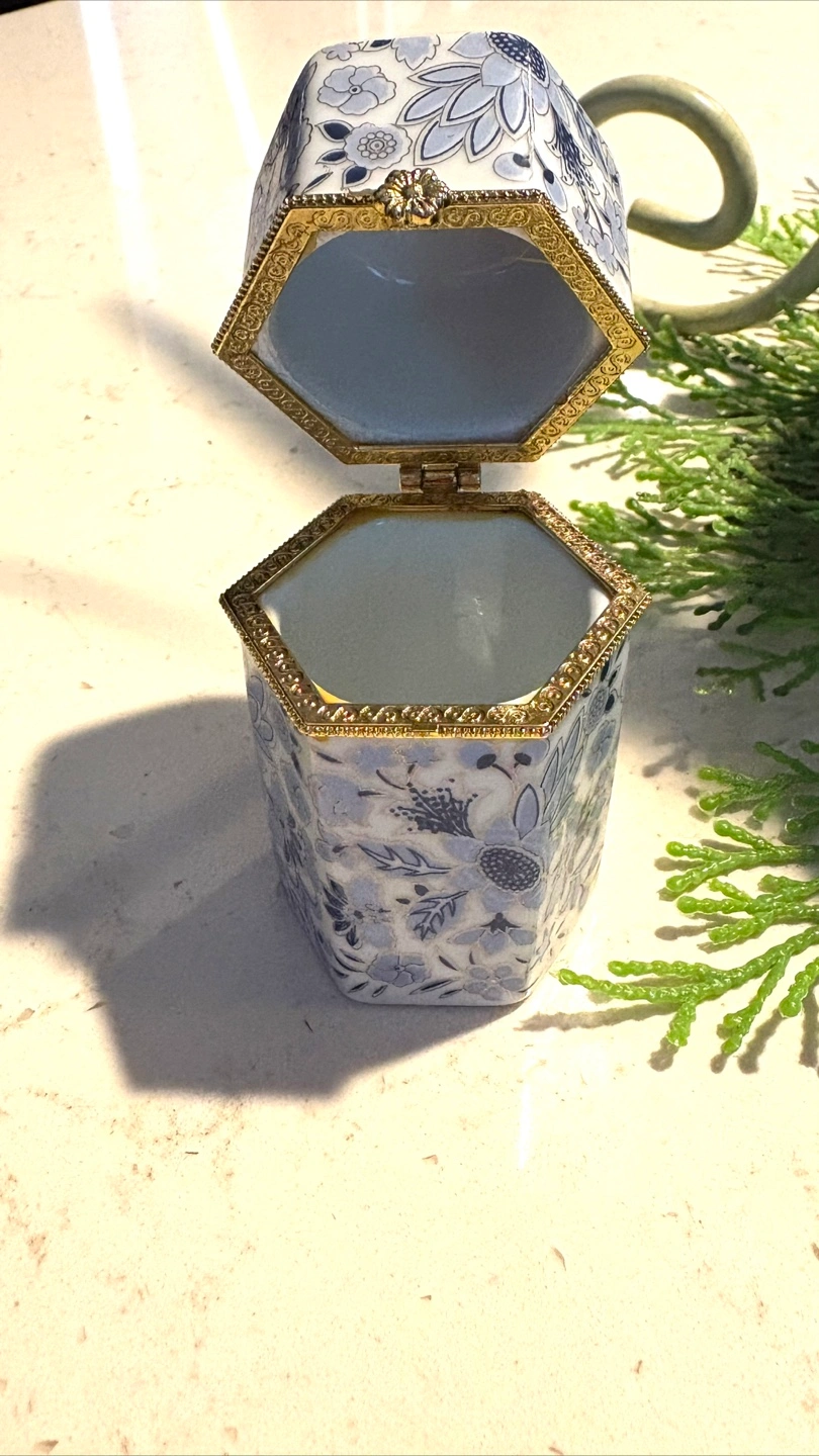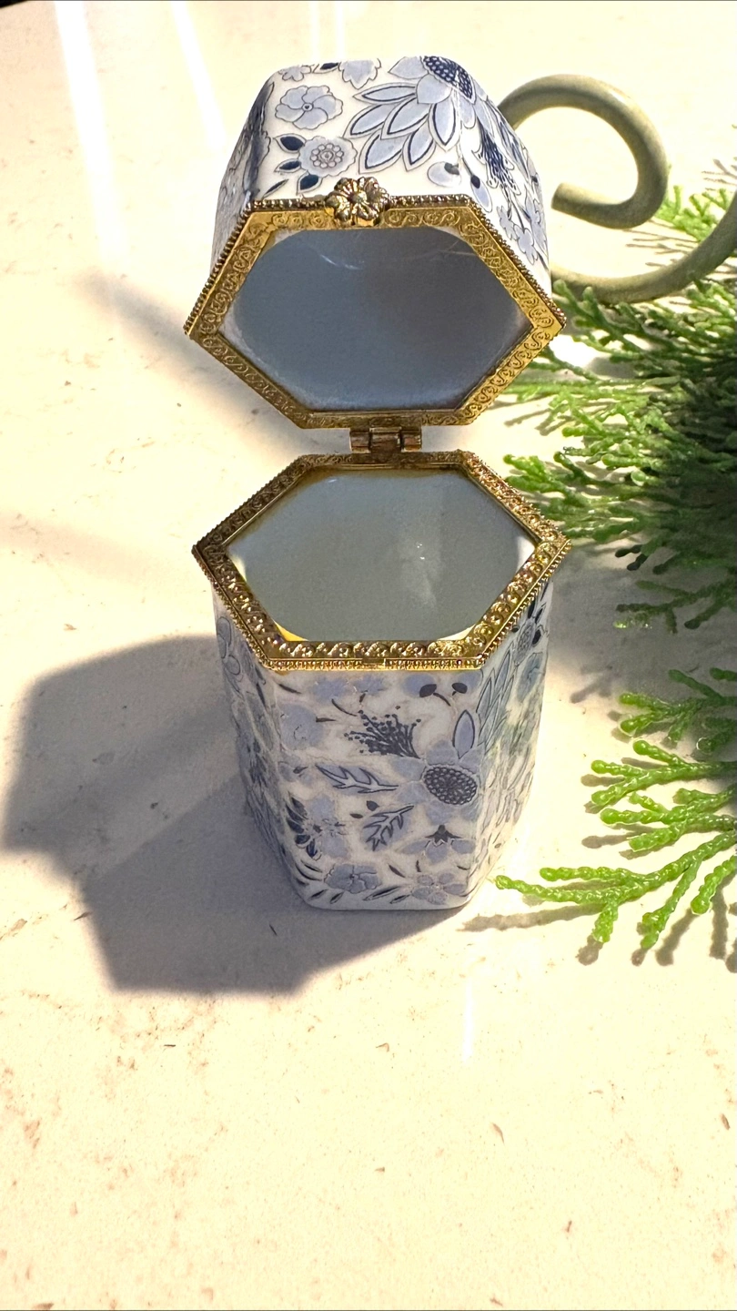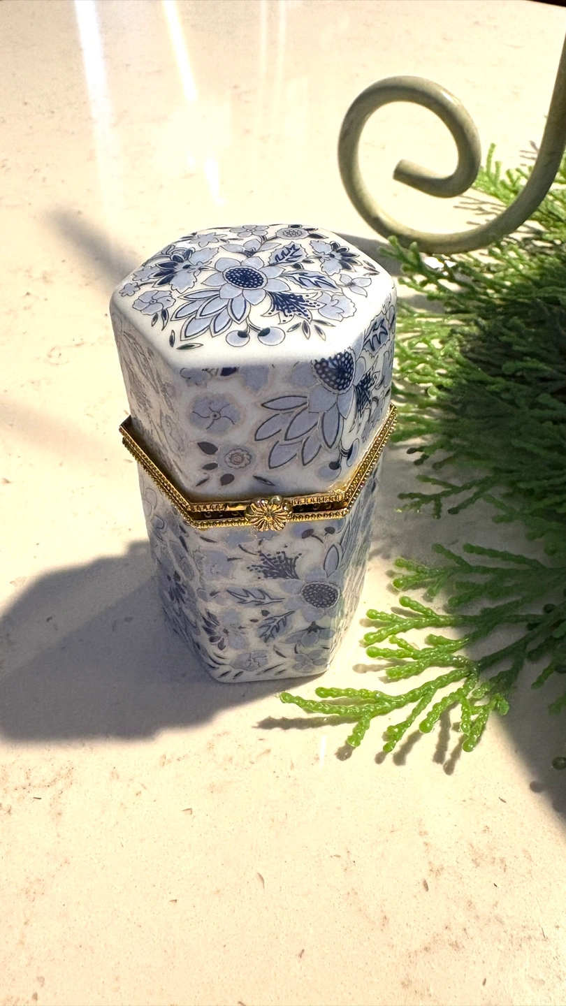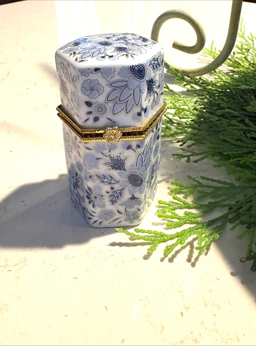 Cute little trinket box with a floral design! It's in great condition and perfect for storing toothpicks, small jewelry , hair pins or keepsakes.