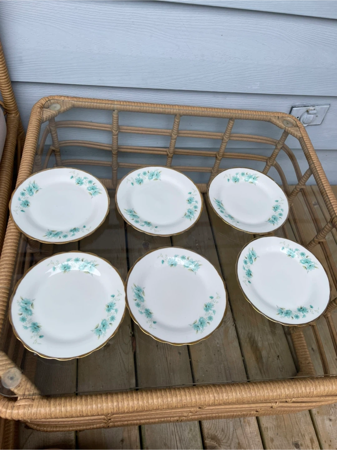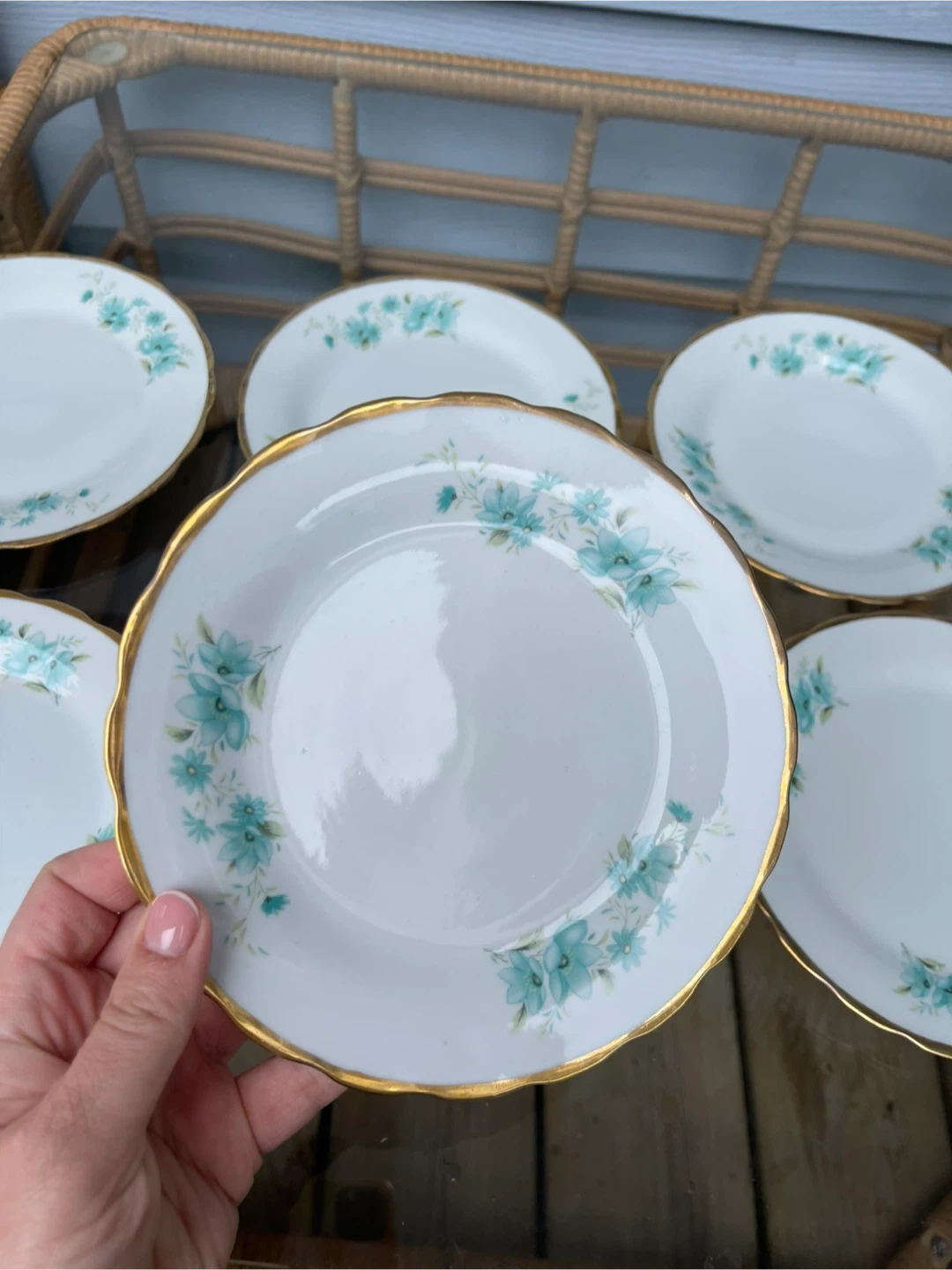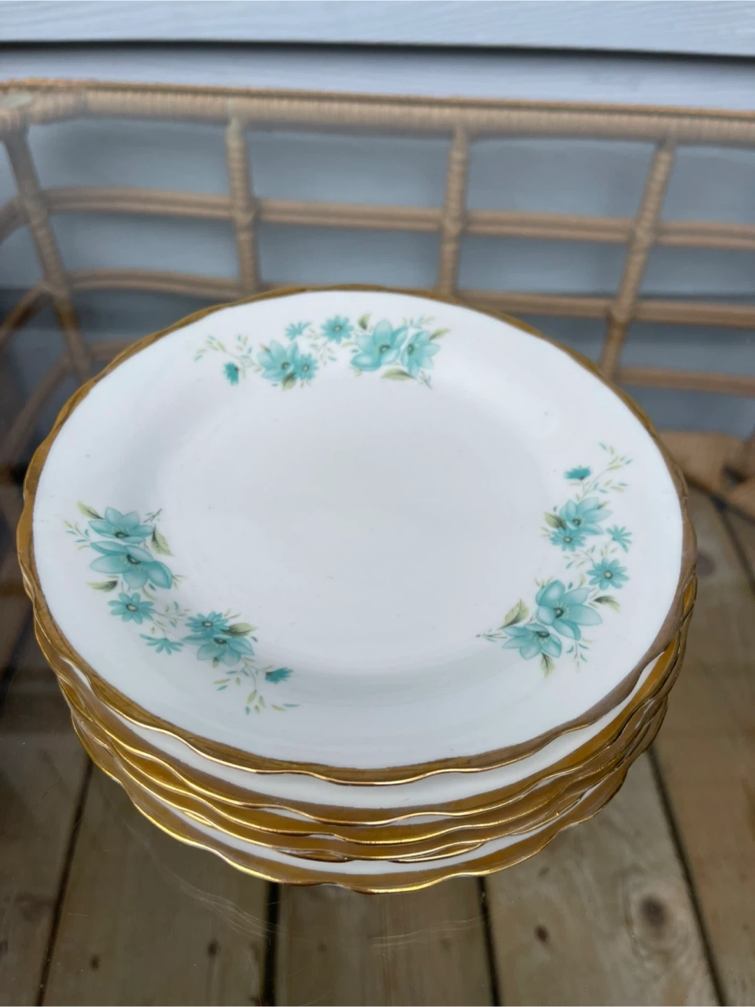 Selling a set of six lovely china plates! They feature a delicate floral pattern in shades of blue and green, complemented by a gold trim. Perfect for adding a touch of elegance to your table setting!