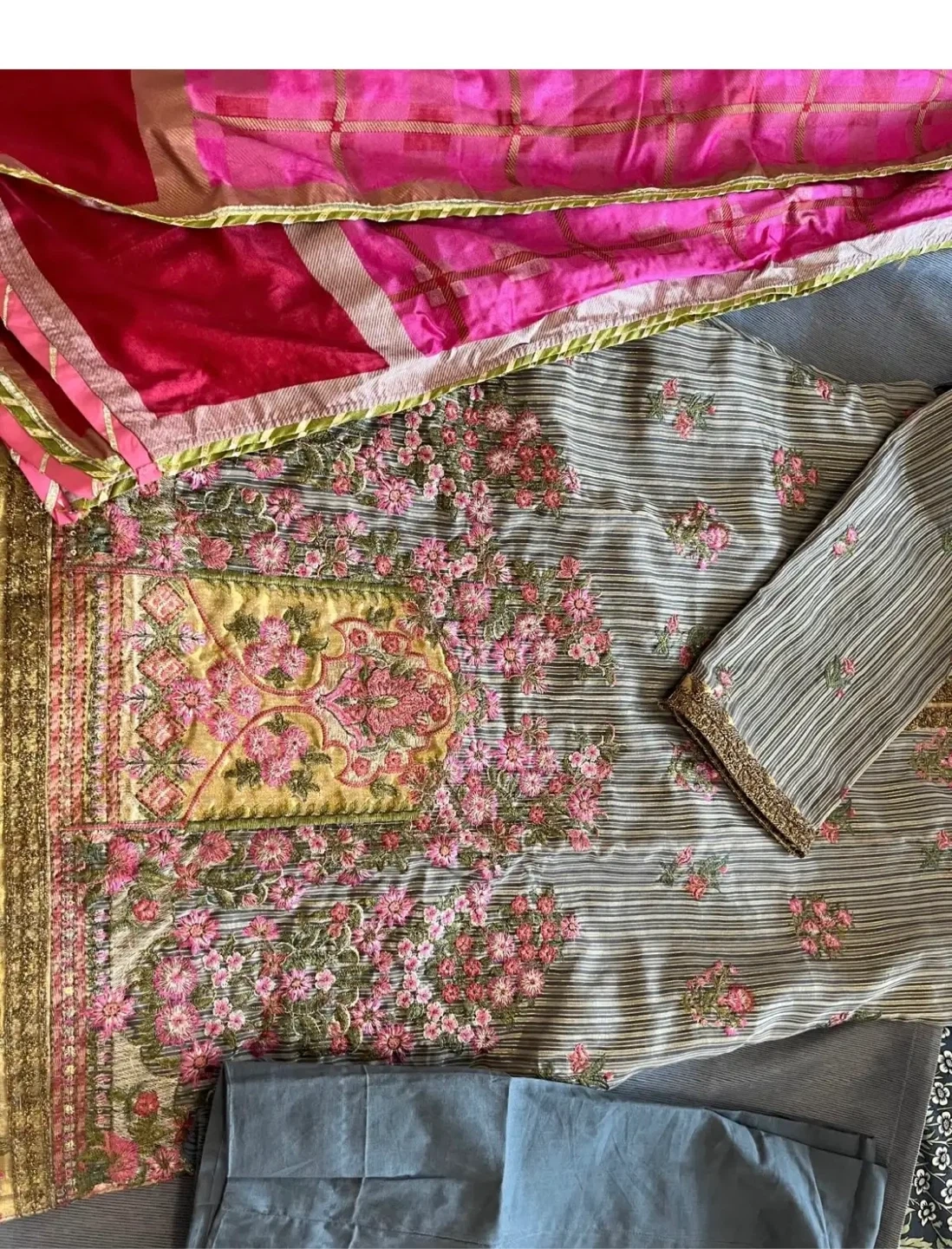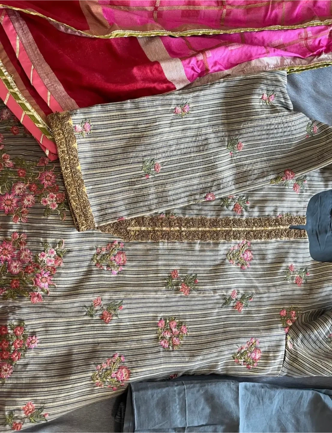 10Beautiful shalwar kameez suit featuring delicate floral embroidery and striped pattern. Perfect for special occasions or everyday wear! Comes with a matching dupatta and bottoms. The fabric feels soft and comfortable, making it a pleasure to wear. The intricate detailing adds a touch of elegance to the outfit