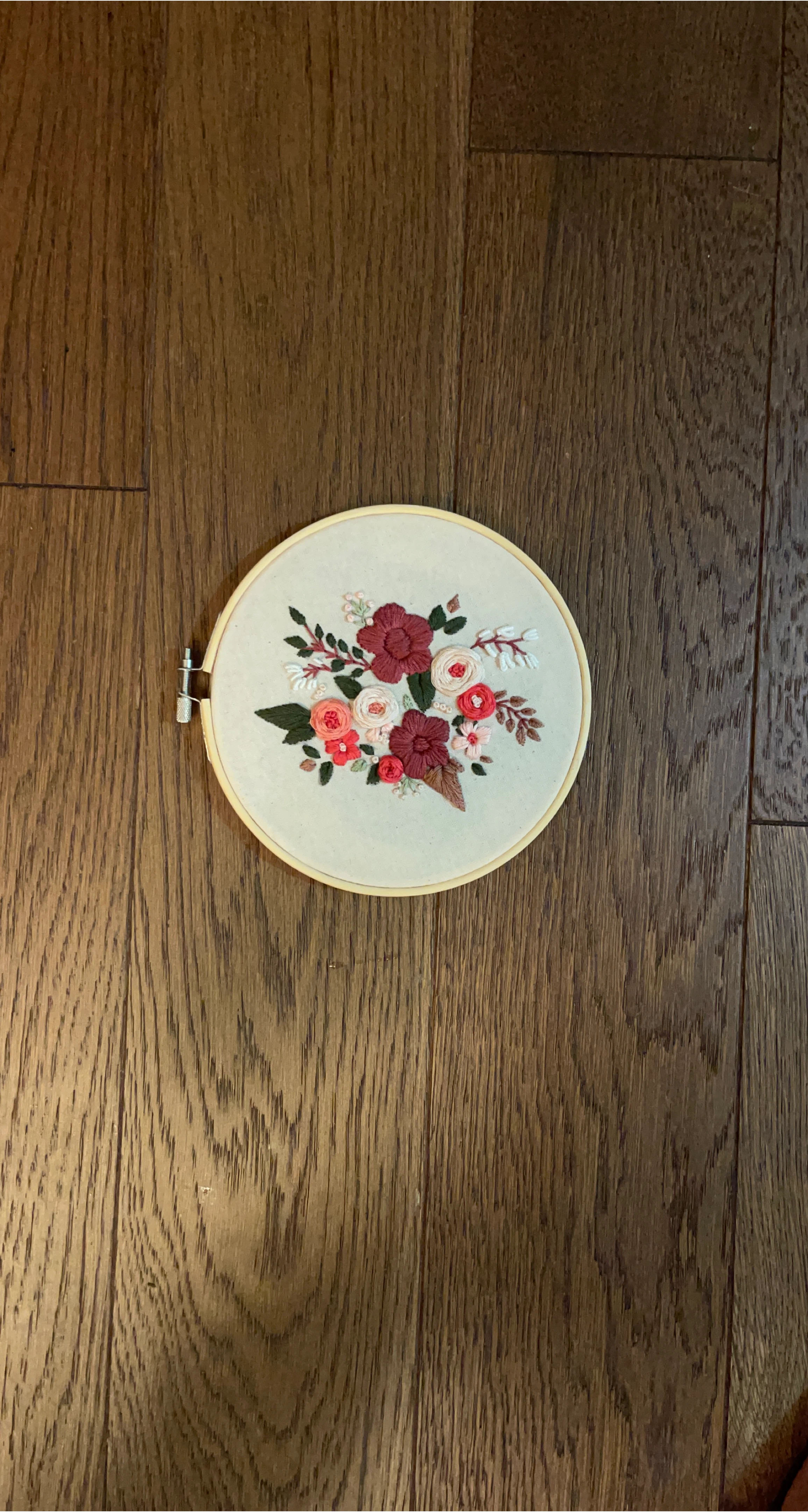 Selling a lovely piece of floral embroidery hoop art. It features a beautiful arrangement of burgundy, pink, and white flowers. Perfect for adding a touch of handmade charm to your home decor!