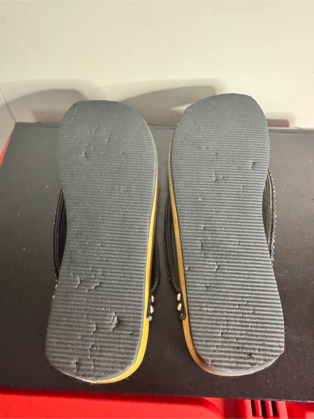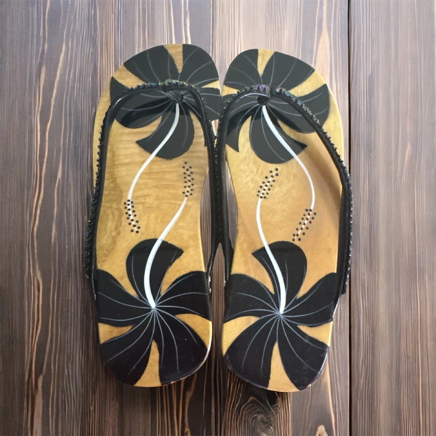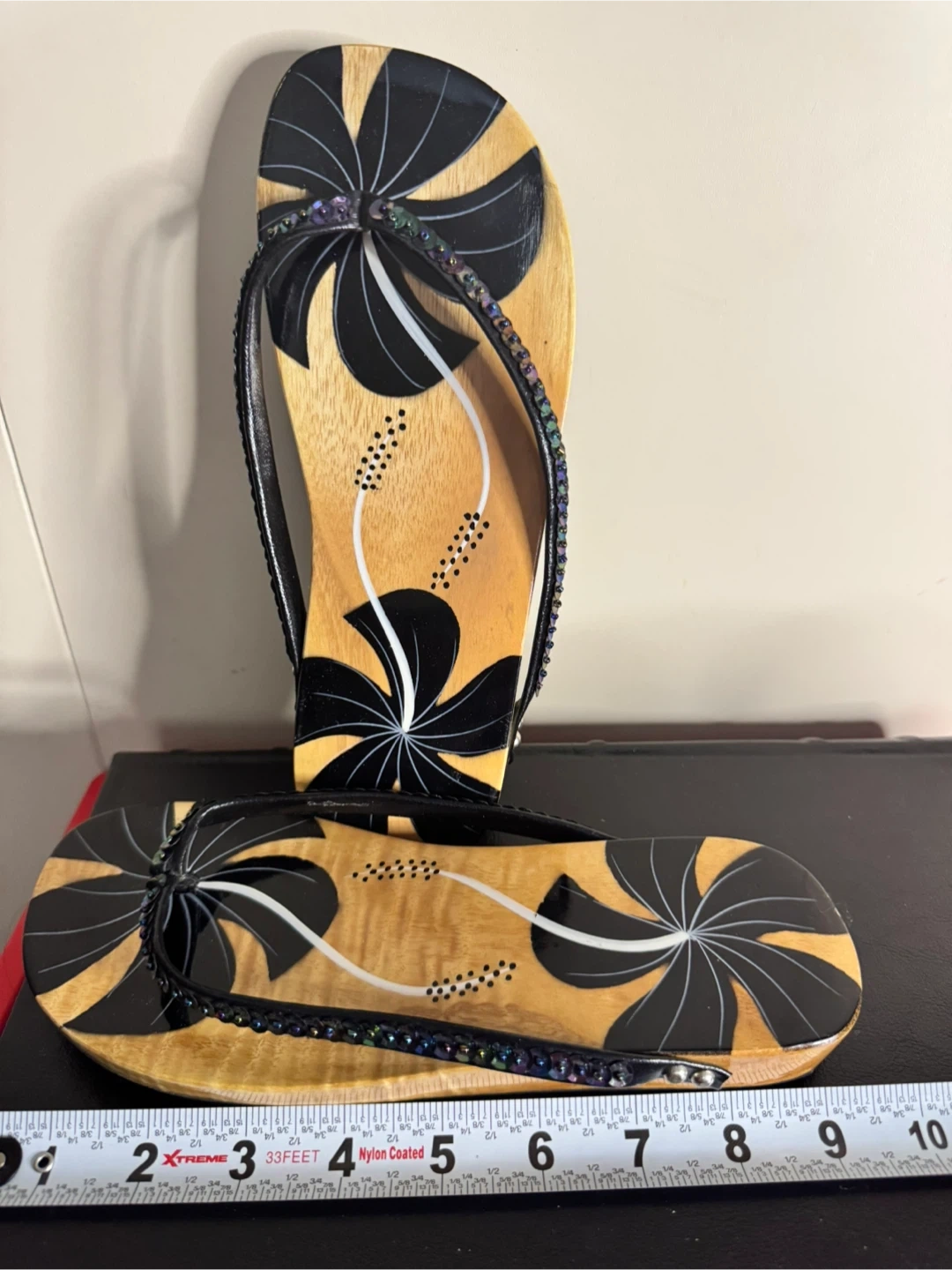 Cute pair of flip flops with a black floral design on a wood-look base. The straps are black and have a beaded detail. Size 9. Perfect for summer!