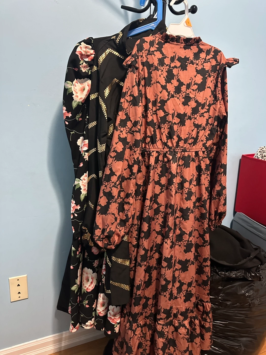 Selling a set of three dresses in great condition! Two are floral print and one is a black dress with geometric gold designs. Perfect for different occasions!