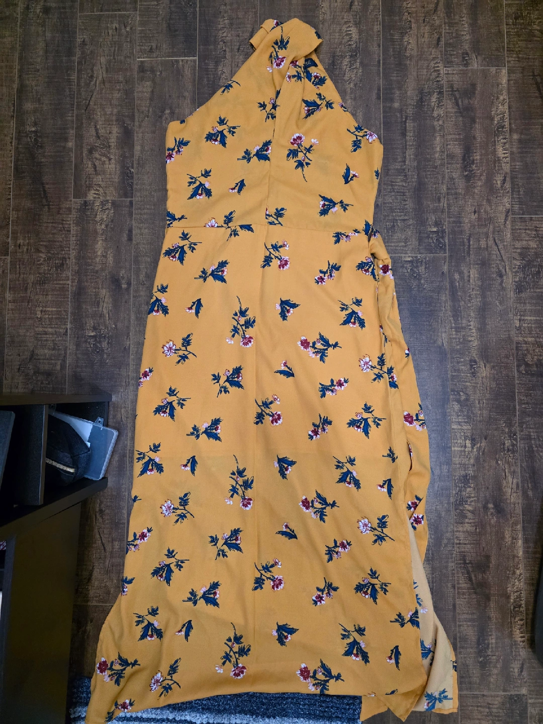 Cute mustard yellow dress with a floral print! It features a halter neckline and a side slit. Perfect for summer days or evenings out