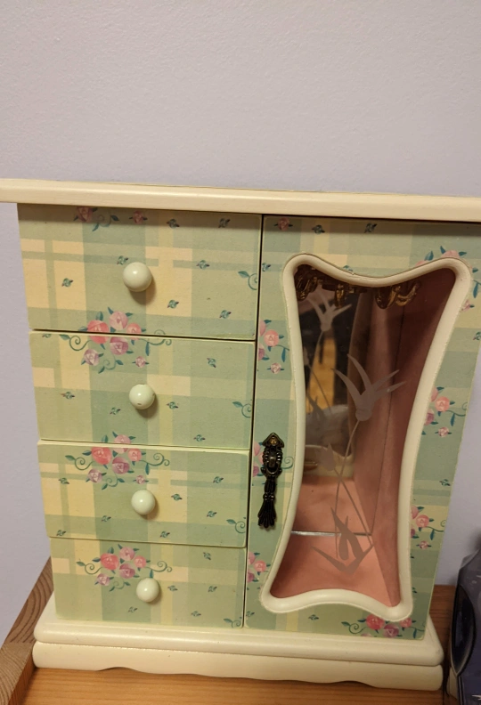 123Cute jewelry box with a floral pattern! It features three drawers and a door with rotating hooks for hanging jewelry. in great condition.