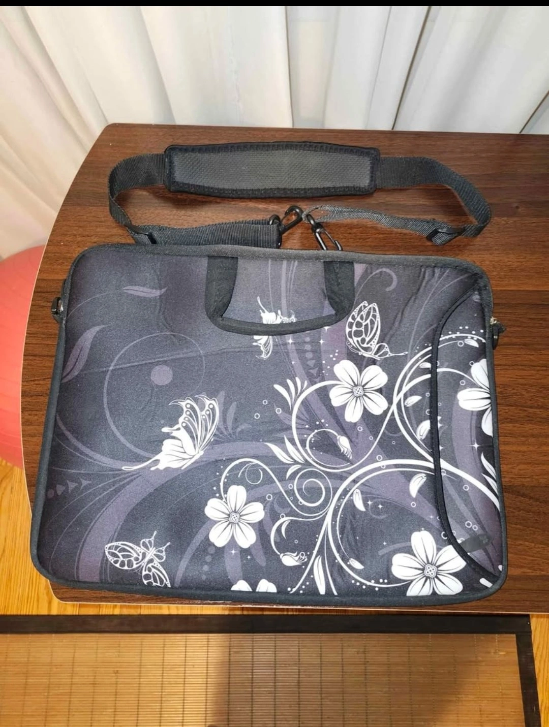 49Neoprene laptop sleeve. Features a black and white floral design. Includes an adjustable shoulder strap. Great for protecting your laptop.