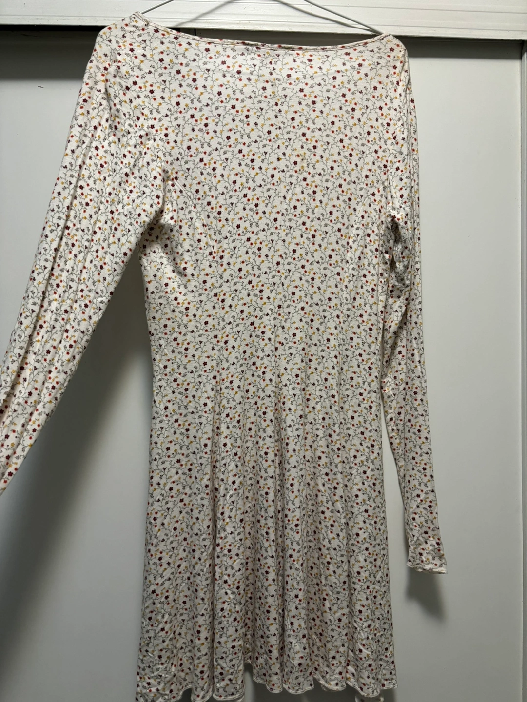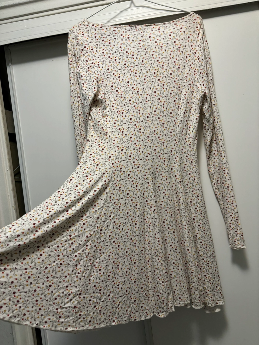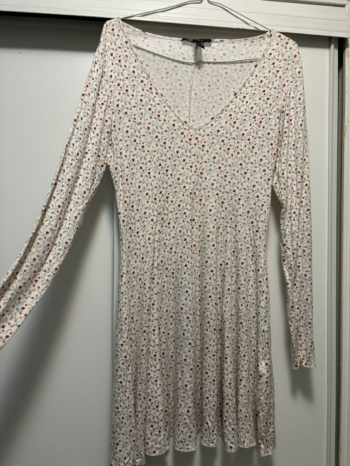 This is a long-sleeved floral dress with a V-neck and a fitted bodice. The dress has a flared skirt and a colourful floral print. Very very comfortable