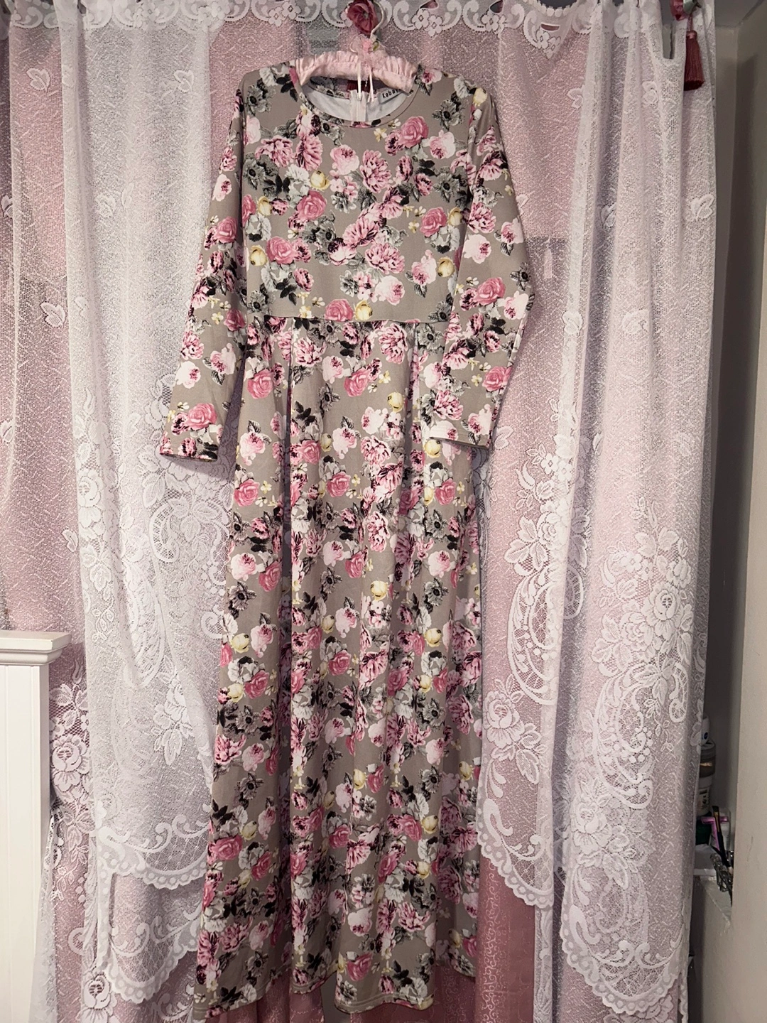 A lovely floral maxi dress with long sleeves! Perfect for any occasion. It features a beautiful floral pattern in shades of pink, grey, and black.